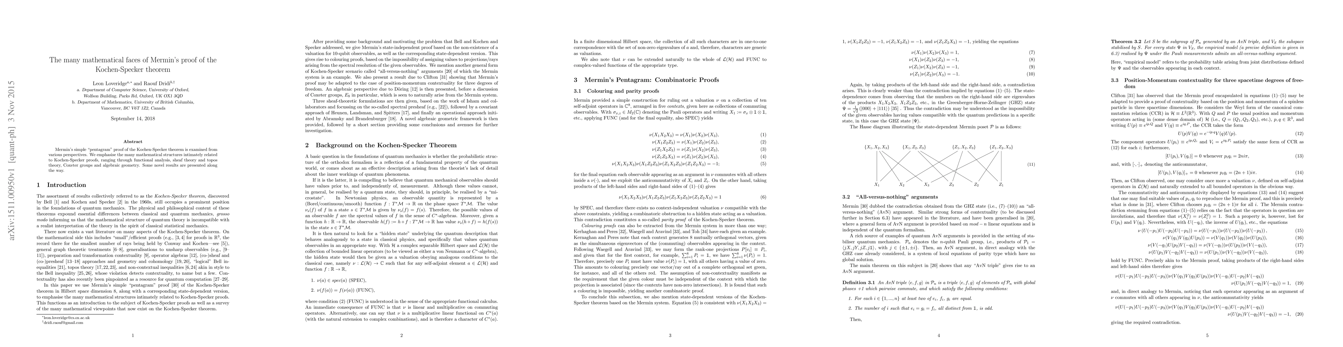 Summary: This paper explores Mermin's "pentagram" proof of the Kochen-Specker theorem through diverse mathematical lenses, including functional analysis, sheaf theory, and algebraic geometry, revealing novel insights and connections.