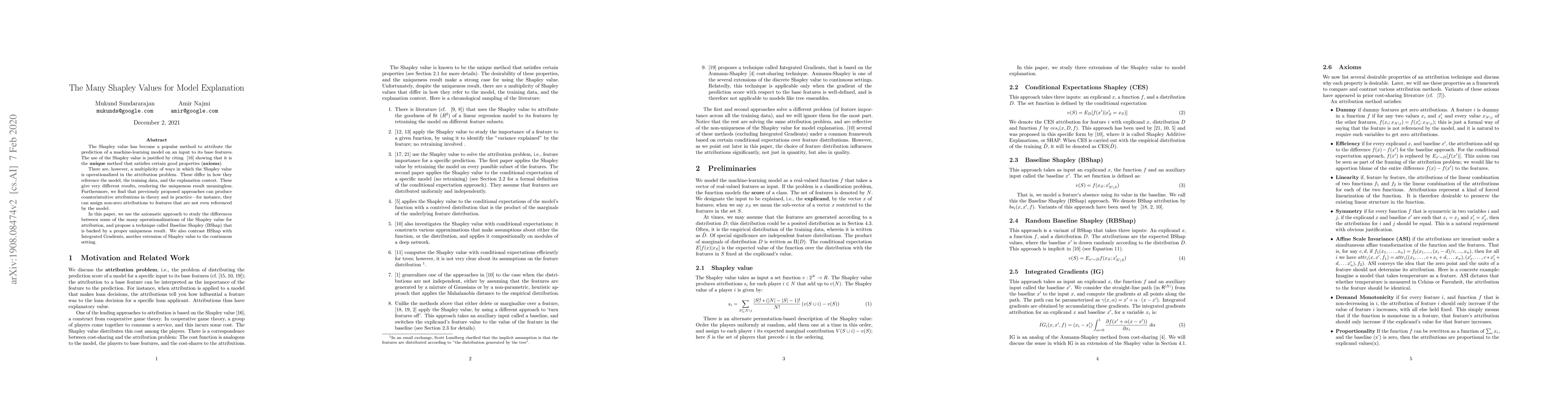 This paper explores the various operationalizations of the Shapley value for attributing machine-learning model predictions to features, revealing that the uniqueness claim is invalid due to differing implementations. It proposes Baseline Shapley (BShap) with a proper uniqueness result and contrasts it with Integrated Gradients.