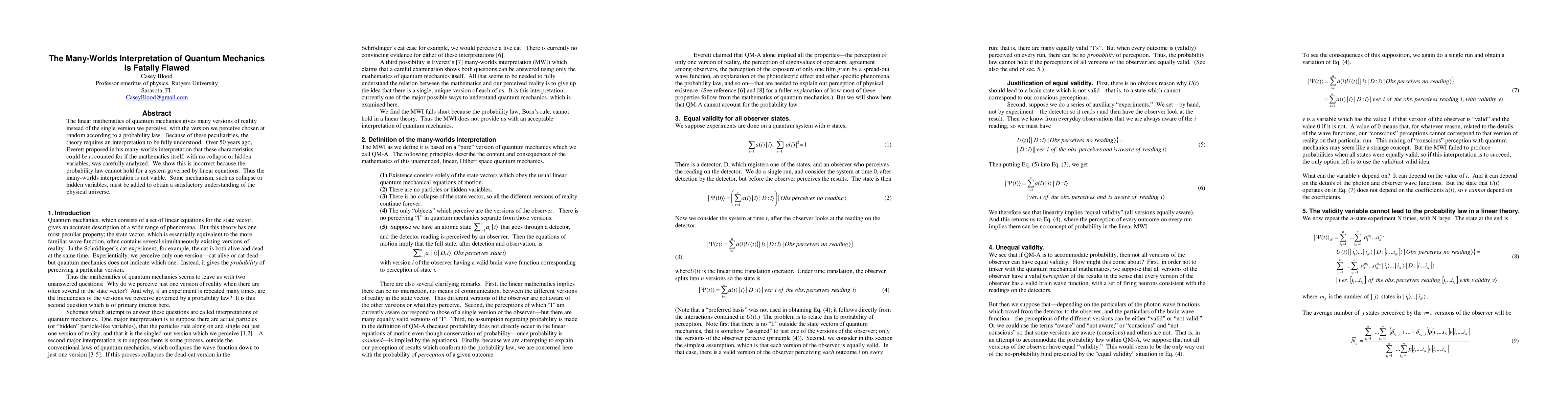 The linear mathematics of quantum mechanics gives many versions of reality instead of the single version we perceive, with the perceived version chosen at random according to a probability law. Because of these peculiarities, the theory requires an interpretation to be fully understood. Over 50 years ago, Everett proposed in his many-worlds interpretation that these characteristics could be accounted for if the mathematics itself, with no collapse or hidden variables, was carefully analyzed. We show this is incorrect; the linear mathematics cannot account for the probability law. Thus the many-worlds interpretation is not viable. Some mechanism, such as collapse or hidden variables, must be added to obtain a satisfactory understanding of the physical universe.