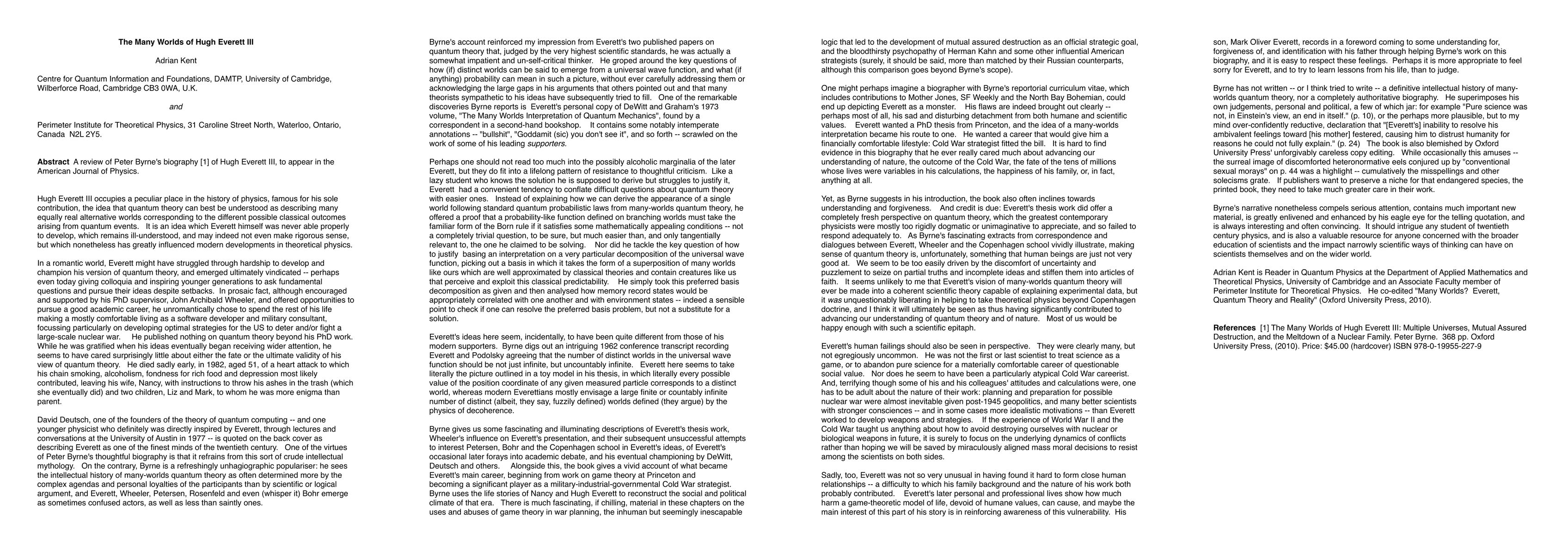 A review of Peter Byrne's biography of Hugh Everett III, "The Many Worlds of Hugh Everett III: Multiple Universes, Mutual Assured Destruction, and the Meltdown of a Nuclear Family", (Oxford University Press, 2010).