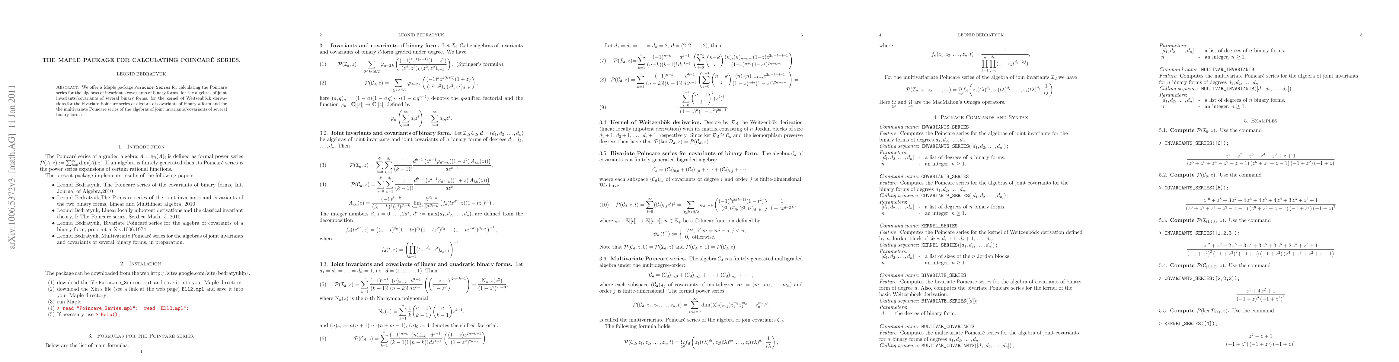 The paper introduces a Maple package called Poincare_Series for calculating Poincaré series related to various algebraic structures, including invariants/covariants of binary forms, joint invariants/covariants of several binary forms, kernel of Weitzenböck derivations, and multivariate Poincaré series for joint invariants/covariants.
