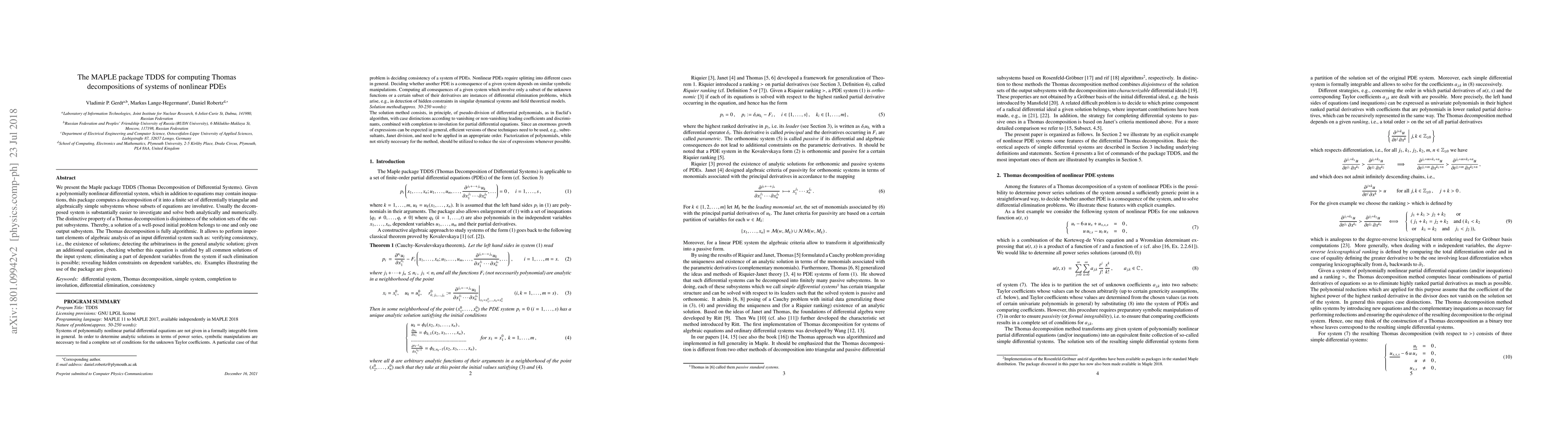 The Maple package TDDS computes Thomas decompositions for polynomially nonlinear differential systems, breaking them into simpler, involutive subsystems. This decomposition aids in both analytical and numerical investigations by ensuring disjoint solution sets for each subsystem.