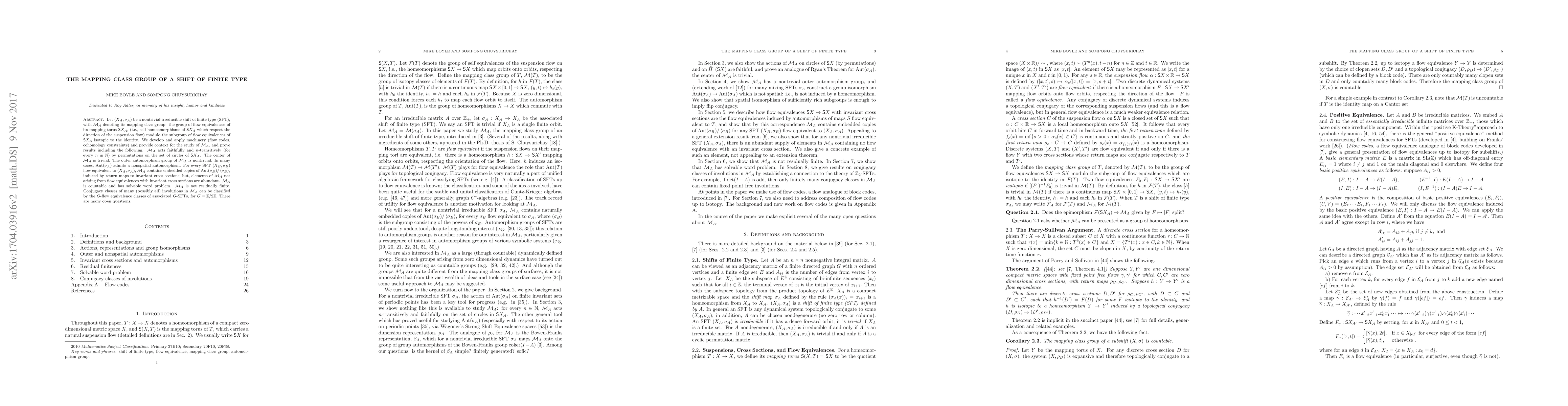 This paper investigates the mapping class group of an irreducible shift of finite type, revealing it is countable, not residually finite, and acts faithfully by permuting circles in its mapping torus, with a solvable word problem and a trivial center. Many open questions remain about this intriguing group.