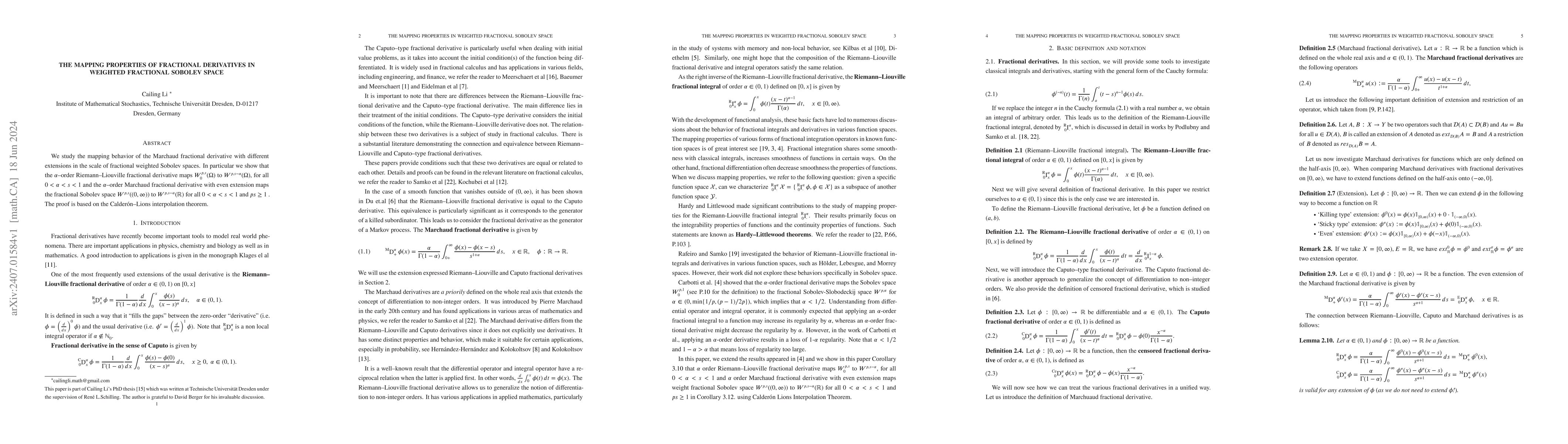 This research investigates the mapping behavior of fractional derivatives in weighted fractional Sobolev spaces, demonstrating that both Riemann-Liouville and Marchaud fractional derivatives exhibit specific mapping properties. The results rely on the Calderón-Lions interpolation theorem.