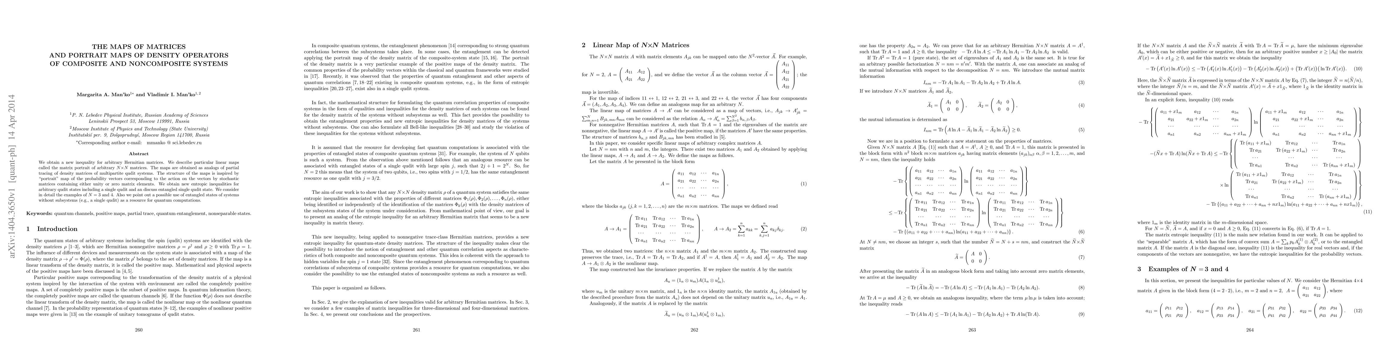 This paper introduces a new inequality for Hermitian matrices and describes linear maps termed matrix portraits, analogous to partial tracing in density matrices of multipartite systems. It also explores entropic inequalities for qudit states and discusses the potential use of entangled single qudit states for quantum computations.