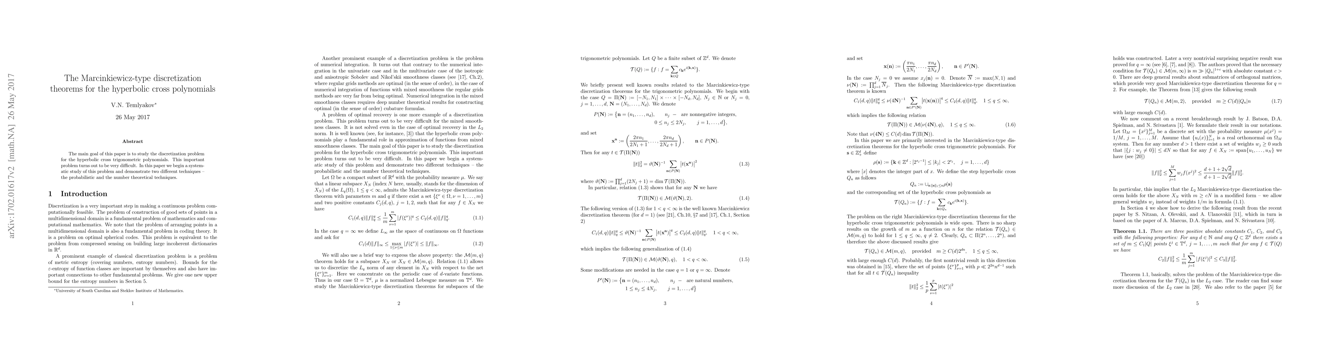 The main goal of this paper is to study the discretization problem for the hyperbolic cross trigonometric polynomials. This important problem turns out to be very difficult. In this paper we begin a systematic study of this problem and demonstrate two different techniques -- the probabilistic and the number theoretical techniques.