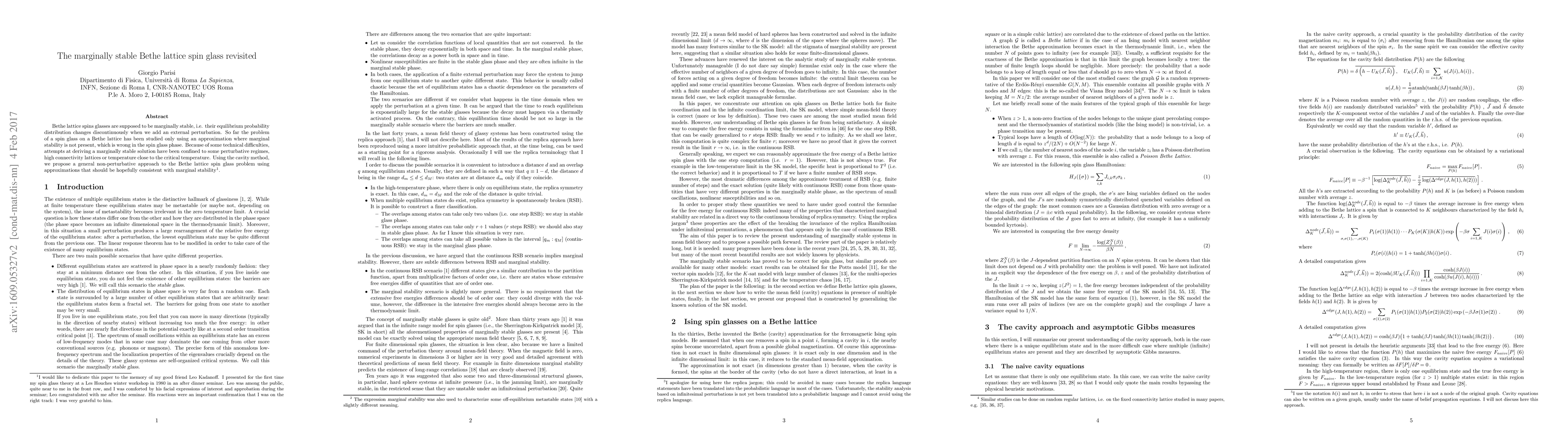 This paper revisits the marginally stable Bethe lattice spin glass problem using a non-perturbative approach via the cavity method. Previous studies lacked marginal stability, which is crucial in the spin glass phase, and new approximations aim to rectify this issue.