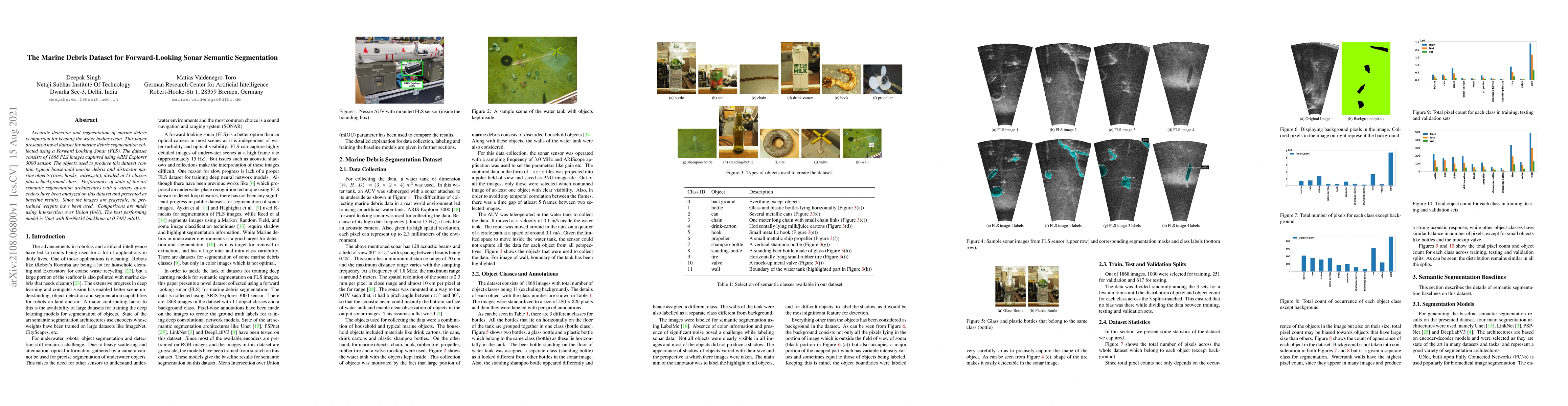 This paper introduces a new dataset of 1868 grayscale Forward Looking Sonar images for marine debris segmentation, featuring 11 debris classes and a background. The best performing model, Unet with ResNet34, achieves a mean Intersection over Union (mIoU) of 0.7481.