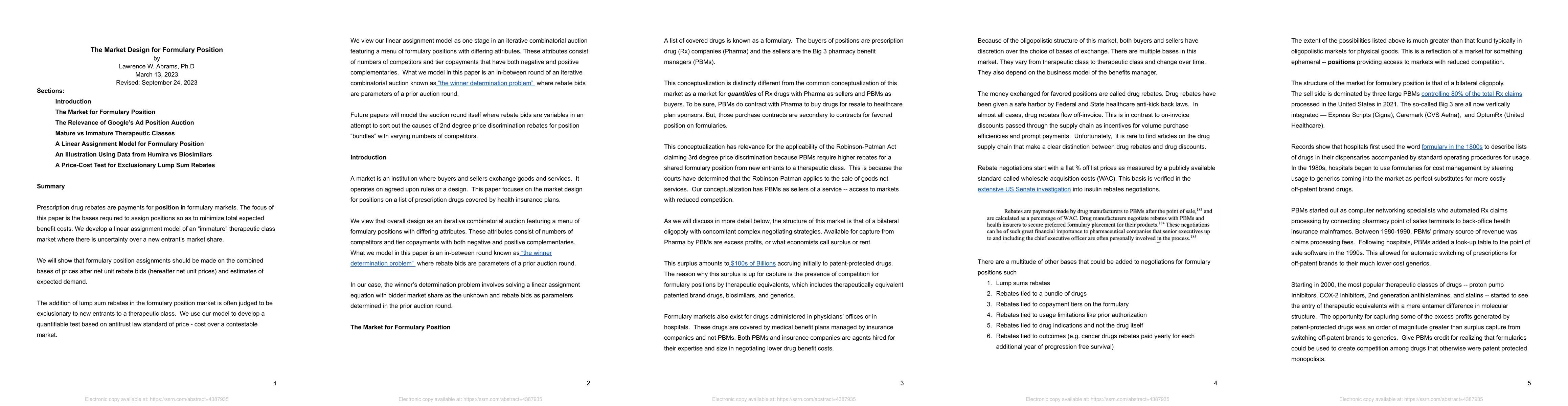 Summary: This paper models the exchange of rebates for formulary positions as a multi-round combinatorial auction, proposing a linear assignment model to determine winners based on net unit prices and expected demand. The study aims to optimize the allocation process in pharmaceutical formularies.