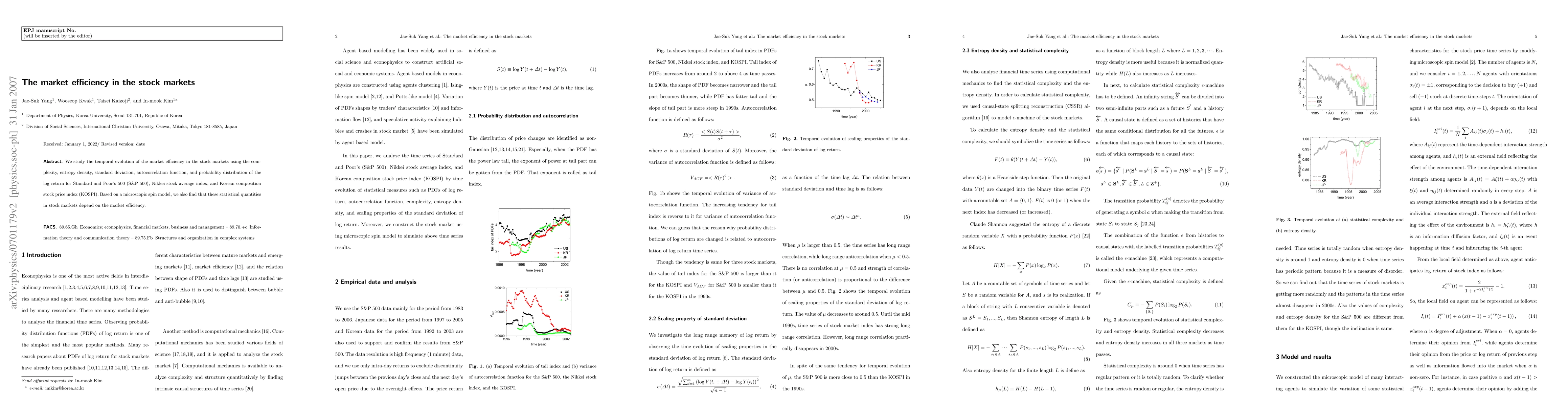 This research investigates the temporal evolution of market efficiency in major stock markets using complexity, entropy density, standard deviation, autocorrelation, and log return probability distribution. It finds that these statistical measures correlate with market efficiency, as modeled by the microscopic spin model.