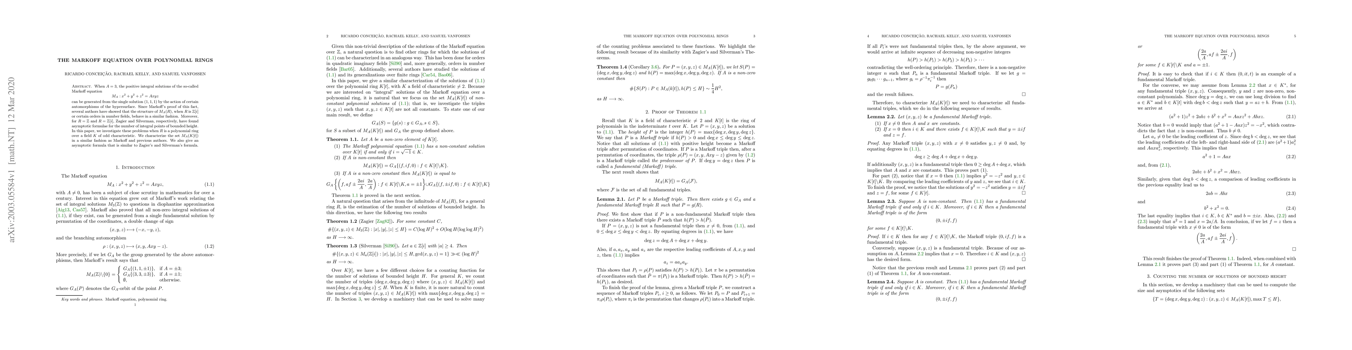 This paper explores the Markoff equation \(M_A: x^2 + y^2 + z^2 = Axyz\) over polynomial rings \(K[t]\) where \(K\) is a field of odd characteristic. It characterizes the structure of solutions generated from initial solutions, analogous to Markoff's original work, and provides an asymptotic formula for the number of integral points similar to Zagier's and Silverman's results.