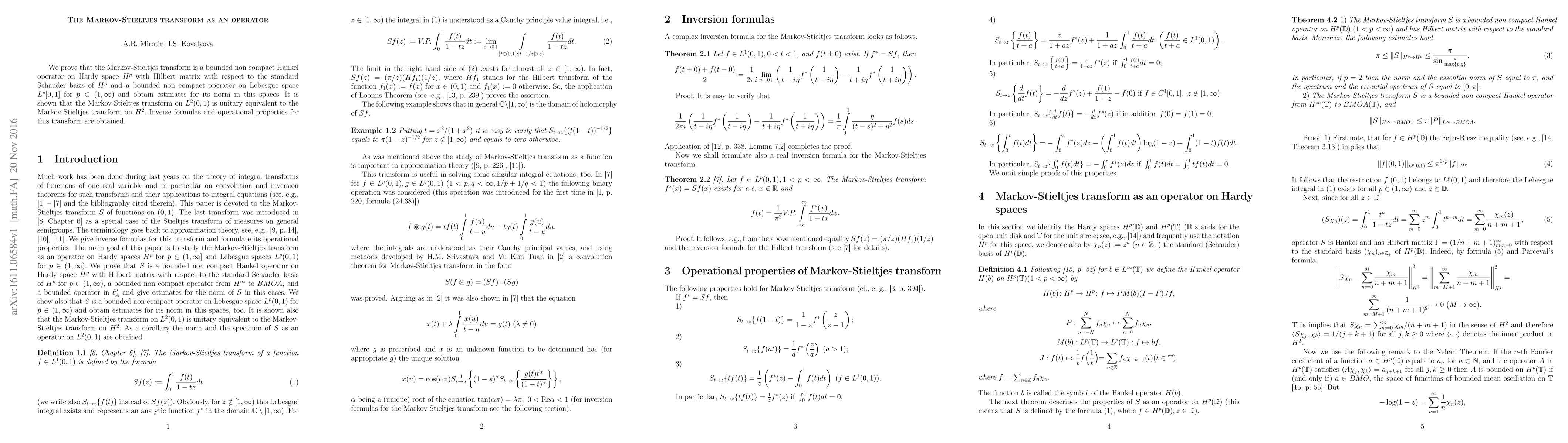 We prove that the Markov-Stieltjes transform is a bounded non compact Hankel operator on Hardy space $H^p$ with Hilbert matrix with respect to the standard Schauder basis of $H^p$ and a bounded non compact operator on Lebesgue space $L^p[0,1]$ for $p\in(1,\infty)$ and obtain estimates for its norm in this spaces. It is shown that the Markov-Stieltjes transform on $L^2(0,1)$ is unitary equivalent to the Markov-Stieltjes transform on $H^2$. Inverse formulas and operational properties for this transform are obtained.
