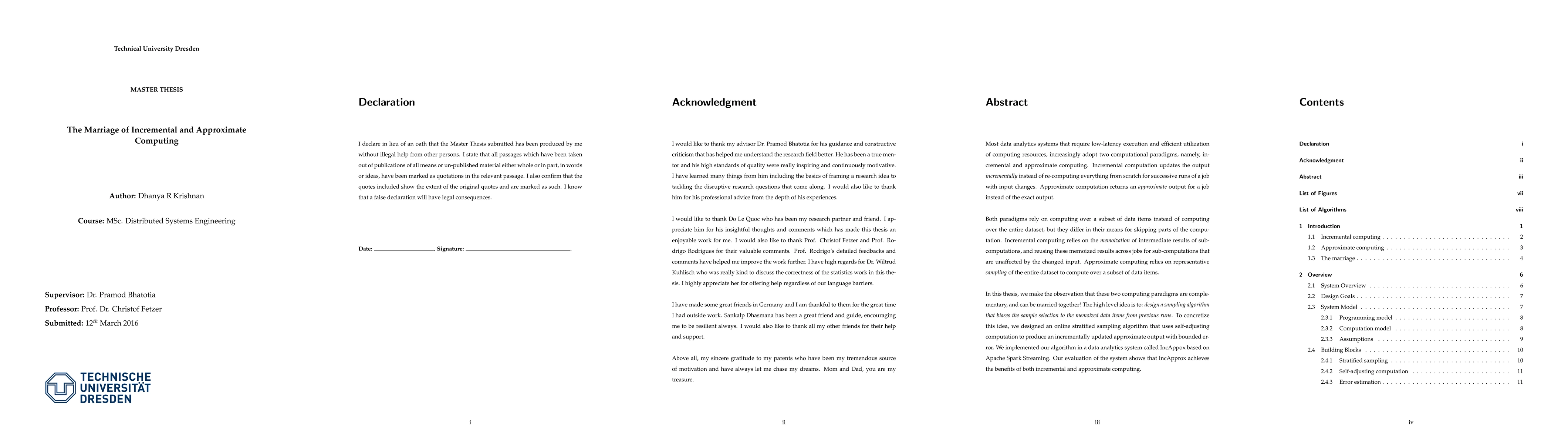 Most data analytics systems that require low-latency execution and efficient utilization of computing resources, increasingly adopt two computational paradigms, namely, incremental and approximate computing. Incremental computation updates the output incrementally instead of re-computing everything from scratch for successive runs of a job with input changes. Approximate computation returns an approximate output for a job instead of the exact output. Both paradigms rely on computing over a subset of data items instead of computing over the entire dataset, but they differ in their means for skipping parts of the computation. Incremental computing relies on the memoization of intermediate results of sub-computations, and reusing these memoized results across jobs for sub-computations that are unaffected by the changed input. Approximate computing relies on representative sampling of the entire dataset to compute over a subset of data items. In this thesis, we make the observation that these two computing paradigms are complementary, and can be married together! The high level idea is to: design a sampling algorithm that biases the sample selection to the memoized data items from previous runs. To concretize this idea, we designed an online stratified sampling algorithm that uses self-adjusting computation to produce an incrementally updated approximate output with bounded error. We implemented our algorithm in a data analytics system called IncAppox based on Apache Spark Streaming. Our evaluation of the system shows that IncApprox achieves the benefits of both incremental and approximate computing.