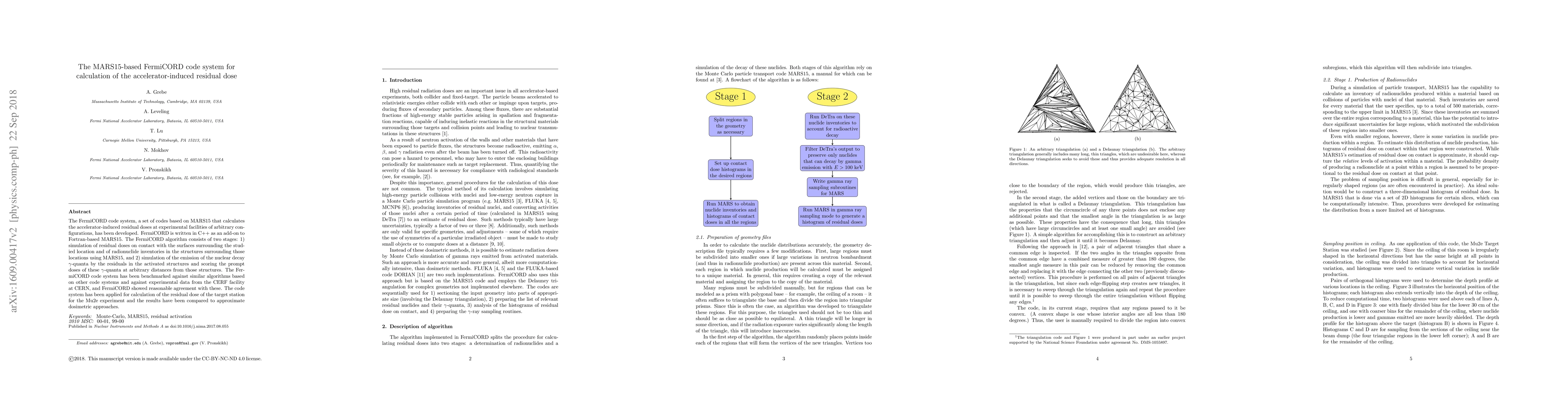 The FermiCORD code system, based on MARS15, calculates accelerator-induced residual doses at experimental facilities. It consists of two stages: simulating residual doses and radionuclide inventories, followed by scoring $\gamma$-quanta emission and prompt doses. Benchmarked against CERN data, it shows reasonable agreement and was applied to the Mu2e experiment.