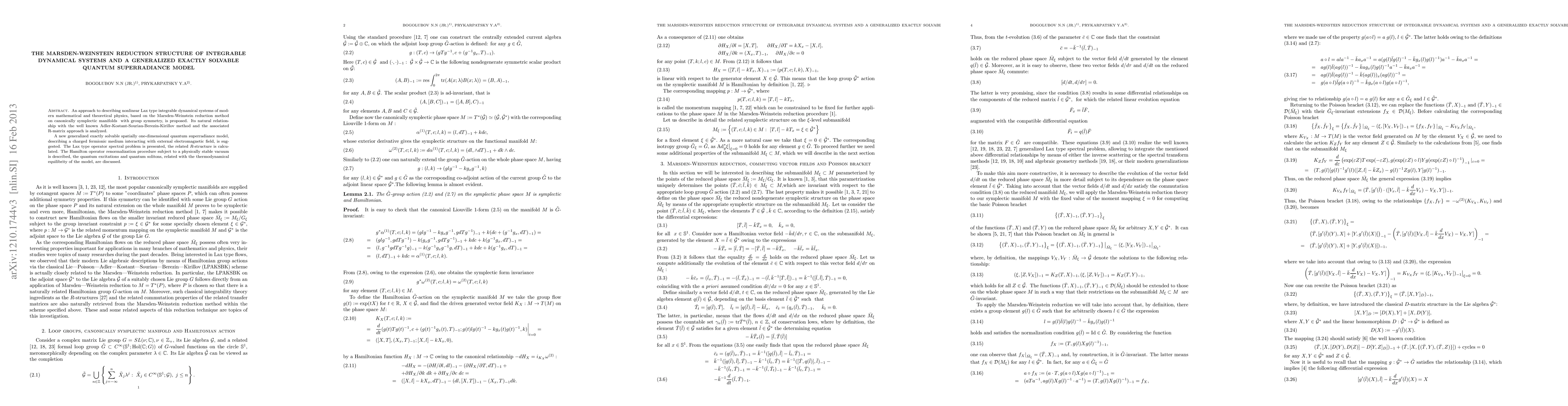 An approach to describing nonlinear Lax type integrable dynamical systems of modern mathematical and theoretical physics, based on the Marsden-Weinstein reduction method on canonically symplectic manifolds \ with group symmetry, is proposed. Its natural relationship with the well known Adler-Kostant-Souriau-Berezin-Kirillov method and the associated R-matrix approach is analyzed. A new generalized exactly solvable spatially one-dimensional quantum superradiance model, describing a charged fermionic medium interacting with external electromagnetic field, is suggested. The Lax type operator spectral problem is presented, the related $R$-structure is calculated. The Hamilton operator renormalization procedure subject to a physically stable vacuum is described, the quantum excitations and quantum solitons, related with the thermodynamical equilibrity of the model, are discussed.
