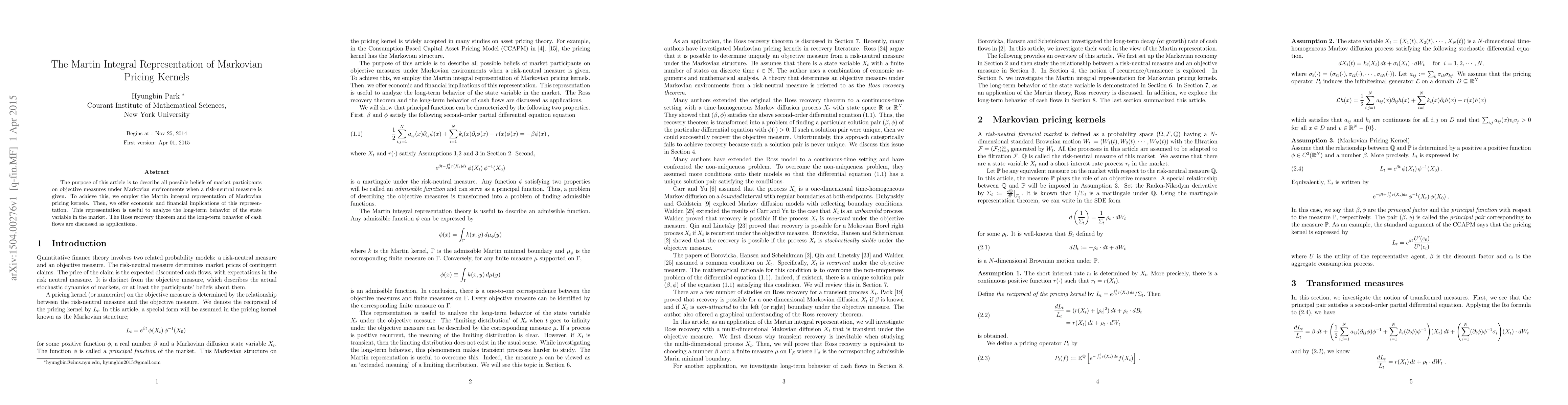 The purpose of this article is to describe all possible beliefs of market participants on objective measures under Markovian environments when a risk-neutral measure is given. To achieve this, we employ the Martin integral representation of Markovian pricing kernels. Then, we offer economic and financial implications of this representation. This representation is useful to analyze the long-term behavior of the state variable in the market. The Ross recovery theorem and the long-term behavior of cash flows are discussed as applications.