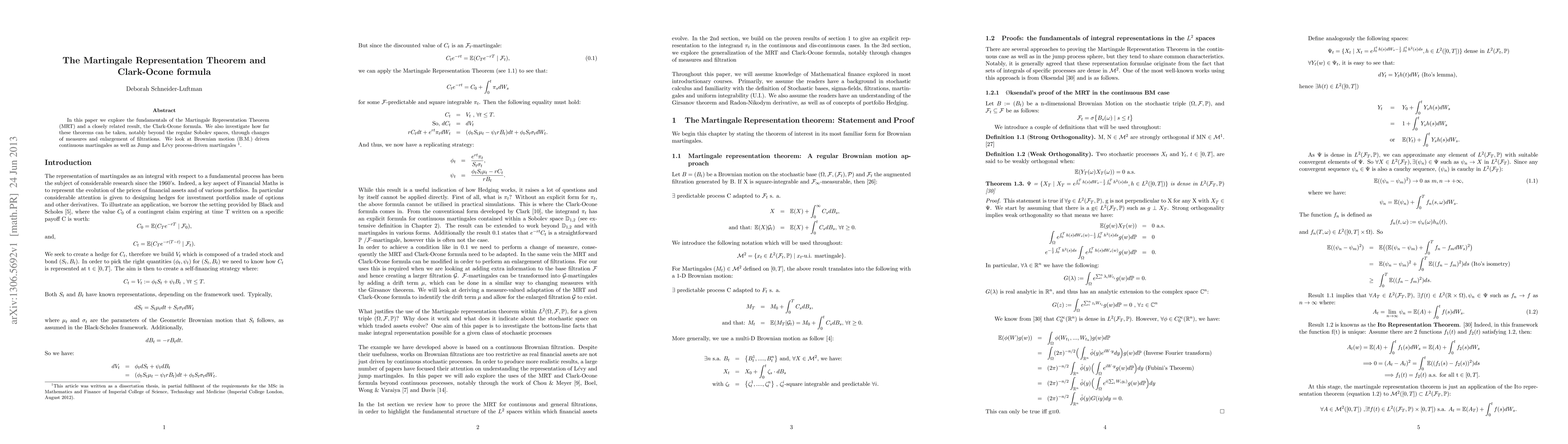 In this paper we explore the fundamentals of the Martingale Representation Theorem (MRT) and a closely related result, the Clark-Ocone formula. We also investigate how far these theorems can be taken, notably beyond the regular Sobolev spaces, through changes of measures and enlargement of filtrations. We look at Brownian motion (B.M.) driven continuous martingales as well as Jump and Levy process-driven martingales.