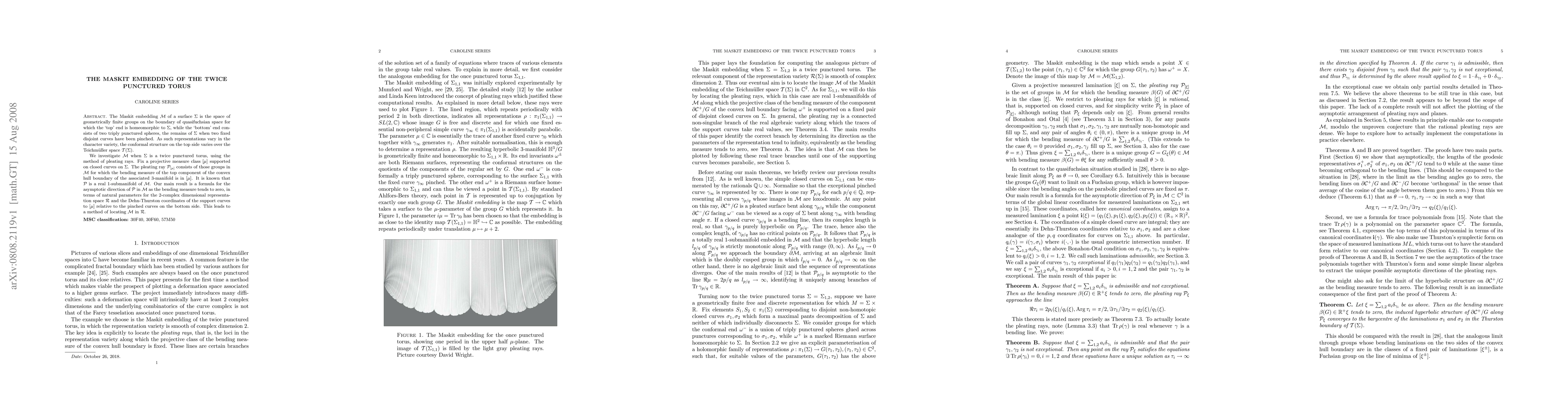 The Maskit embedding M of a surface \Sigma is the space of geometrically finite groups on the boundary of quasifuchsian space for which the `top' end is homeomorphic to \Sigma, while the `bottom' end consists of two triply punctured spheres, the remains of \Sigma when two fixed disjoint curves have been pinched. As such representations vary in the character variety, the conformal structure on the top side varies over the Teichm\"uller space T(\Sigma). We investigate M when \Sigma is a twice punctured torus, using the method of pleating rays. Fix a projective measure class [\mu] supported on closed curves on \Sigma. The pleating ray P_[\mu] consists of those groups in M for which the bending measure of the top component of the convex hull boundary of the associated 3-manifold is in [\mu]. It is known that P is a real 1-submanifold of M. Our main result is a formula for the asymptotic direction of P in M as the bending measure tends to zero, in terms of natural parameters for the 2-complex dimensional representation space R and the Dehn-Thurston coordinates of the support curves to [\mu] relative to the pinched curves on the bottom side. This leads to a method of locating M in R.