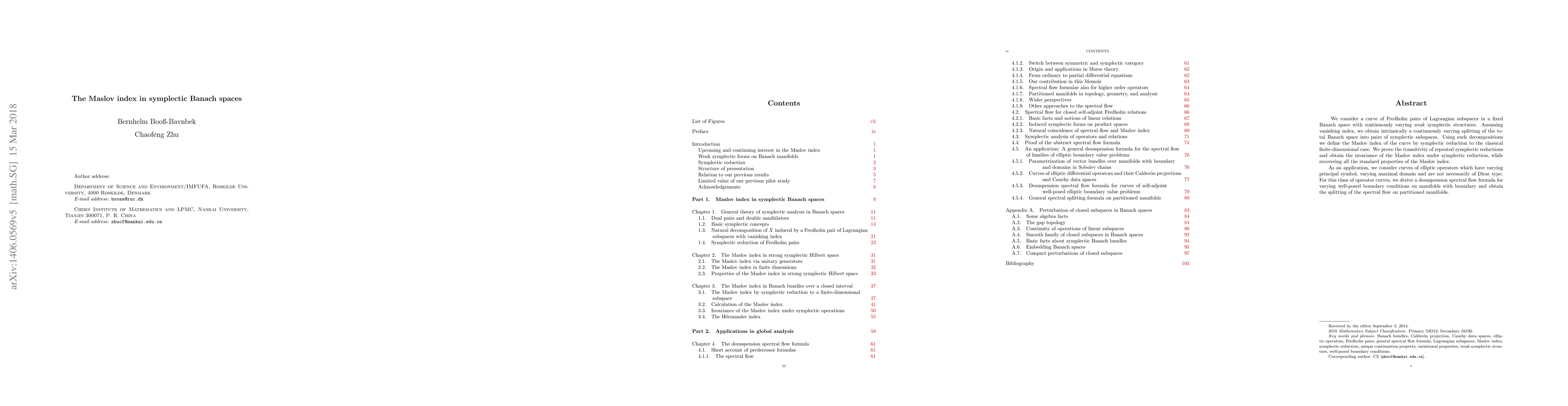 This paper defines the Maslov index for curves of Lagrangian subspaces in symplectic Banach spaces, establishing its invariance under symplectic reduction. It applies this to elliptic operators with varying properties, deriving a spectral flow formula for well-posed boundary conditions on manifolds with boundaries.