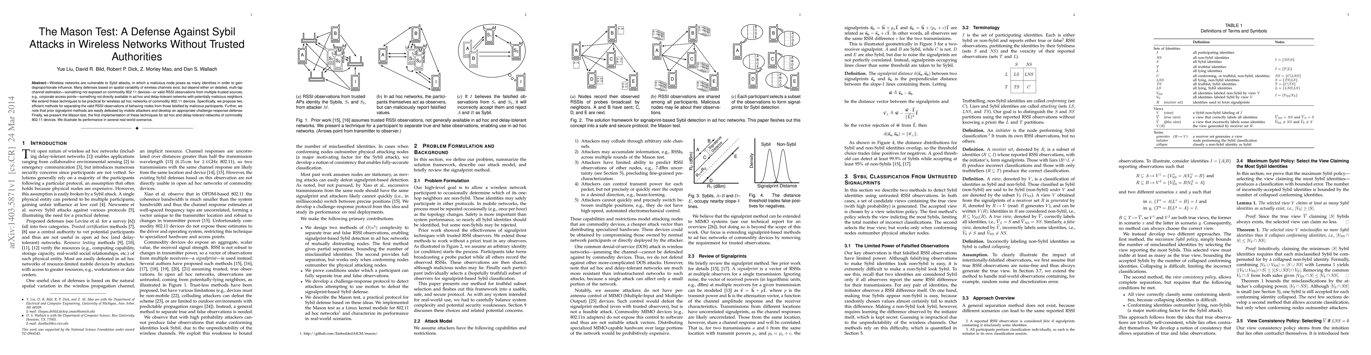 This research introduces the Mason Test, a method to defend wireless ad hoc networks against Sybil attacks using commodity 802.11 devices. It proposes efficient techniques to distinguish valid from falsified RSSI observations and a challenge-response defense against mobile attackers, demonstrating effectiveness in various real-world scenarios.
