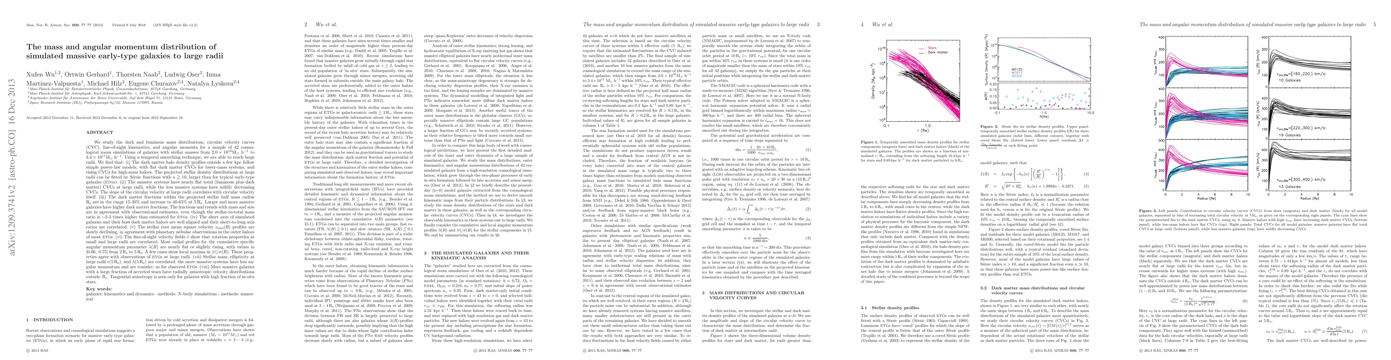 We study the dark and luminous mass distributions, circular velocity curves (CVC), line-of-sight kinematics, and angular momenta for a sample of 42 cosmological zoom simulations of massive galaxies. Using a temporal smoothing technique, we are able to reach large radii. We find that: (i)The dark matter halo density profiles outside a few kpc follow simple power-law models, with flat dark matter CVCs for lower-mass systems, and rising CVCs for high-mass haloes. The projected stellar density distributions at large radii can be fitted by Sersic functions with n>10, larger than for typical ETGs. (ii)The massive systems have nearly flat total CVCs at large radii, while the less massive systems have mildly decreasing CVCs. The slope of the CVC at large radii correlates with v_circ itself. (iii)The dark matter fractions within Re are in the range 15-30% and increase to 40-65% at 5Re. Larger and more massive galaxies have higher dark matter fractions. (iv)The short axes of simulated galaxies and their host dark matter haloes are well aligned and their short-to-long axis ratios are correlated. (v)The stellar vrms(R) profiles are slowly declining, in agreement with planetary nebulae observations in the outer haloes of most ETGs. (vi)The line-of-sight velocity fields v show that rotation properties at small and large radii are correlated. Most radial profiles for the cumulative specific angular momentum parameter lambda(R) are nearly flat or slightly rising, with values in [0.06,0.75] from 2Re to 5Re. (vii)Stellar mass, ellipticity at 5Re, and lambda(5Re) are correlated: the more massive systems have less angular momentum and are rounder, as for observed ETGs. (viii)More massive galaxies with a large fraction of accreted stars have radially anisotropic velocity distributions outside Re. Tangential anisotropy is seen only for galaxies with high fraction of in-situ stars. (Full abstract in PDF)