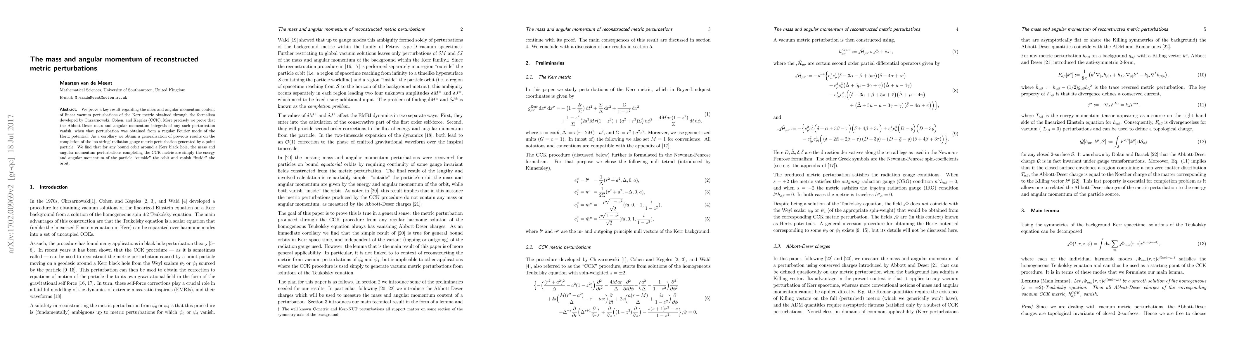 We prove a key result regarding the mass and angular momentum content of linear vacuum perturbations of the Kerr metric obtained through the formalism developed by Chrzarnowski, Cohen, and Kegeles (CCK). More precisely we prove that the Abbott-Deser mass and angular momentum integrals of any such perturbation vanish, when that perturbation was obtained from a regular Fourier mode of the Hertz potential. As a corollary we obtain a generalization of previous results on the completion of the `no string' radiation gauge metric perturbation generated by a point particle. We find that for any bound orbit around a Kerr black hole, the mass and angular momentum perturbations completing the CCK metric are simply the energy and angular momentum of the particle "outside" the orbit and vanish "inside" the orbit.