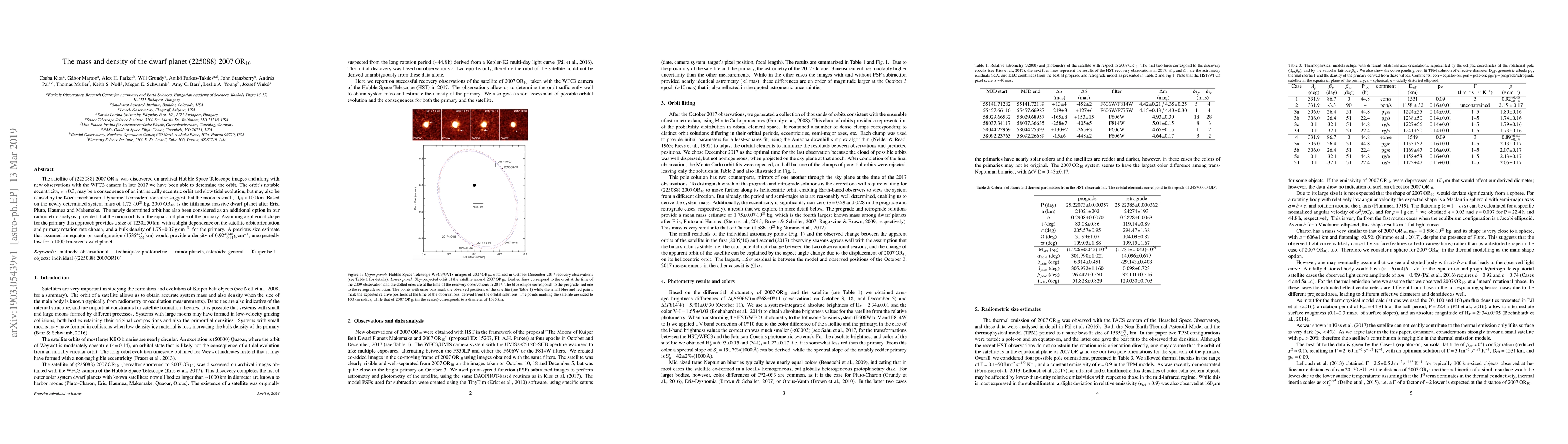 The satellite of (225088) 2007 OR10 was discovered on archival Hubble Space Telescope images and along with new observations with the WFC3 camera in late 2017 we have been able to determine the orbit. The orbit's notable eccentricity, e$\approx$0.3, may be a consequence of an intrinsically eccentric orbit and slow tidal evolution, but may also be caused by the Kozai mechanism. Dynamical considerations also suggest that the moon is small, D$_{eff}$ $<$ 100 km. Based on the newly determined system mass of 1.75x10$^{21}$ kg, 2007 OR10 is the fifth most massive dwarf planet after Eris, Pluto, Haumea and Makemake. The newly determined orbit has also been considered as an additional option in our radiometric analysis, provided that the moon orbits in the equatorial plane of the primary. Assuming a spherical shape for the primary this approach provides a size of 1230$\pm$50 km, with a slight dependence on the satellite orbit orientation and primary rotation rate chosen, and a bulk density of 1.75$\pm$0.07 g cm$^{-3}$ for the primary. A previous size estimate that assumed an equator-on configuration (1535$^{+75}_{-225}$ km) would provide a density of 0.92$^{+0.46}_{-0.14}$ g cm$^{-3}$, unexpectedly low for a 1000 km-sized dwarf planet.