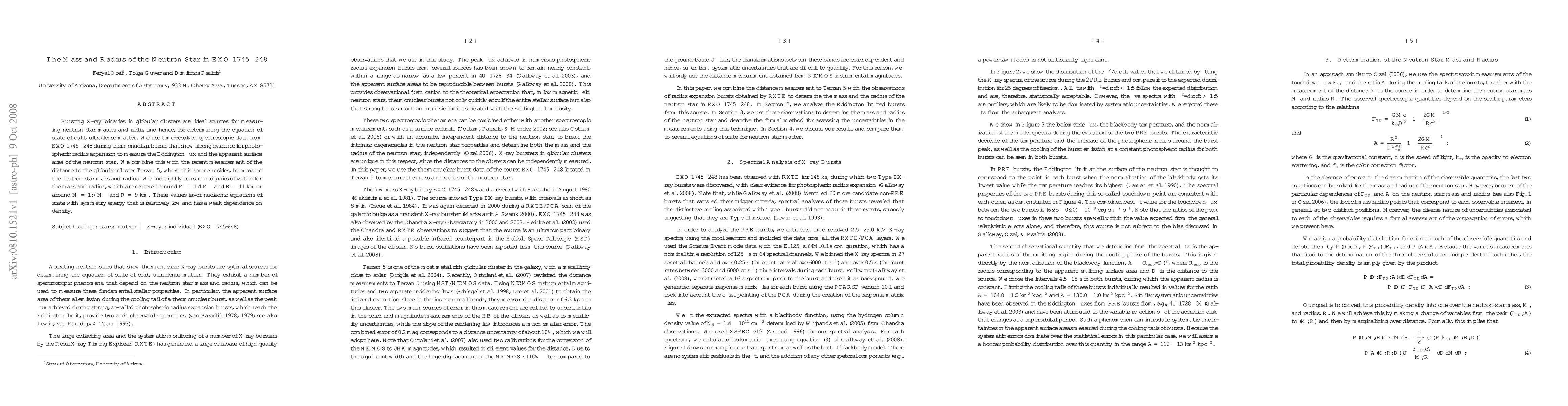 Bursting X-ray binaries in globular clusters are ideal sources for measuring neutron star masses and radii, and hence, for determining the equation of state of cold, ultradense matter. We use time-resolved spectroscopic data from EXO 1745-248 during thermonuclear bursts that show strong evidence for photospheric radius expansion to measure the Eddington flux and the apparent surface area of the neutron star. We combine this with the recent measurement of the distance to the globular cluster Terzan 5, where this source resides, to measure the neutron star mass and radius. We find tightly constrained pairs of values for the mass and radius, which are centered around M=1.4 M_sun and R=11 km or around M=1.7 M_sun and R=9 km. These values favor nucleonic equations of state with symmetry energy that is relatively low and has a weak dependence on density.