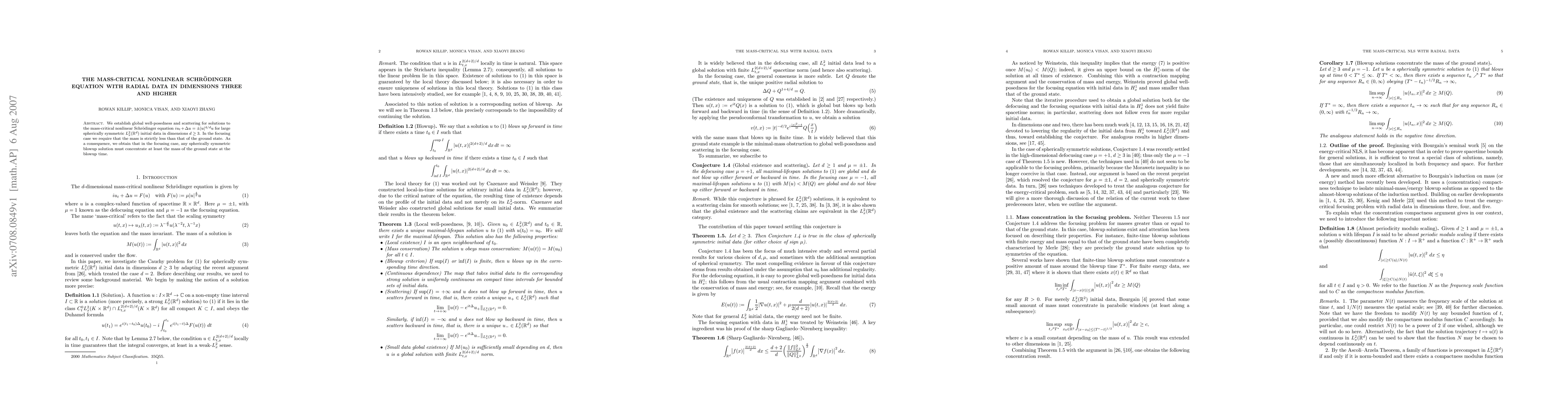 Summary: This paper proves global well-posedness and scattering for mass-critical nonlinear Schrödinger equations with radial initial data in dimensions three and higher. In the focusing case, it shows that blowup solutions must concentrate at least the ground state mass at the blowup time.