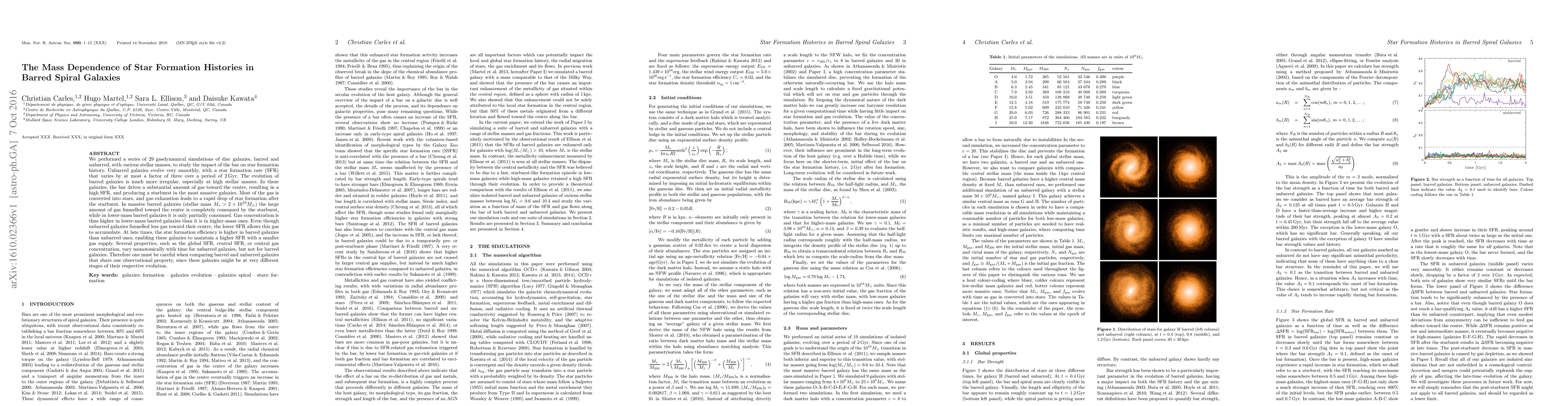 This study uses gasdynamical simulations to show that barred spiral galaxies exhibit more irregular star formation histories compared to unbarred galaxies, especially in massive systems where bars drive gas toward the center, causing starbursts that rapidly exhaust gas and drop star formation. Barred galaxies maintain higher star formation efficiency despite lower gas supplies.