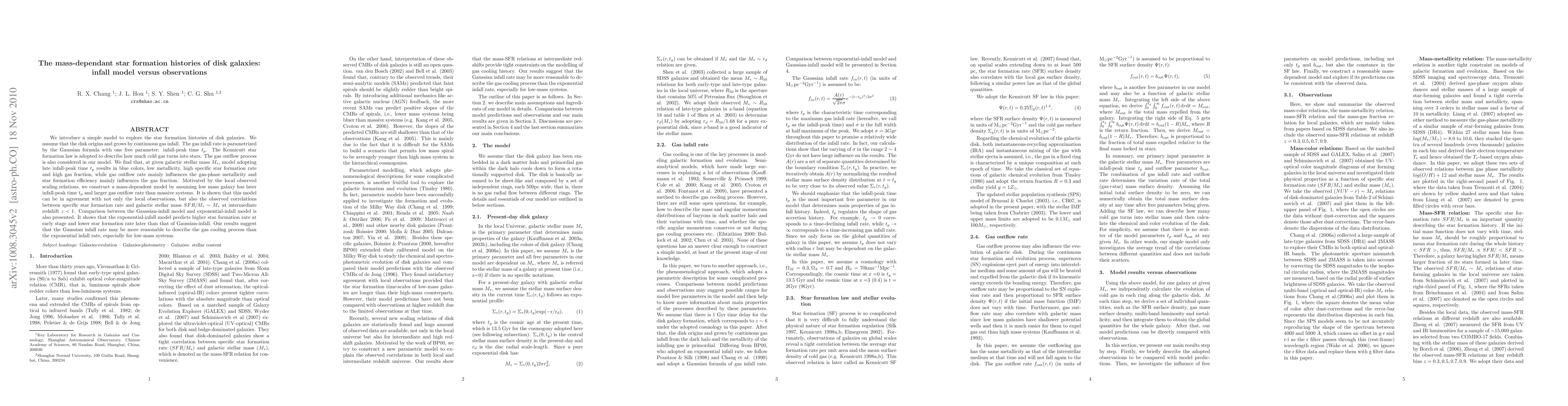 The research introduces a simple model exploring star formation histories of disk galaxies assuming continuous gas infall with a Gaussian formula and considering gas outflow and star formation efficiency. The model is compared against local observations and scaling relations.