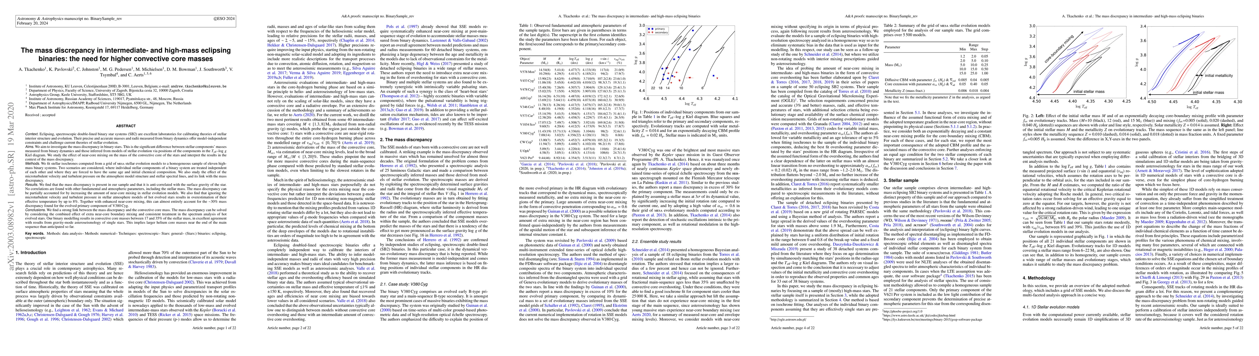 (Abridged) Eclipsing, spectroscopic double-lined binary star systems (SB2) are excellent laboratories for calibrating theories of stellar interior structure and evolution. We aim to investigate the mass discrepancy in binary stars. We study the effect of near-core mixing on the mass of the convective core of the stars and interpret the results in the context of the mass discrepancy. Two scenarios are considered, where individual stellar components of a binary system are treated independent of each other and where they are forced to have the same age and initial chemical composition. We find that the mass discrepancy is present in our sample and that it is anti-correlated with the surface gravity of the star. No correlations are found with other fundamental and atmospheric parameters, including the stellar mass. The mass discrepancy can be partially accounted for by increasing the amount of near-core mixing in stellar evolution models. We also find that ignoring the microturbulent velocity and turbulent pressure in stellar atmosphere models of hot evolved stars results in overestimation of their effective temperature by up to 8%. Together with enhanced near-core mixing, this can almost entirely account for the 30% mass discrepancy found for the evolved primary component of V380 Cyg. We find a strong link between the mass discrepancy and the convective core mass. The mass discrepancy can be solved by considering the combined effect of extra near-core boundary mixing and consistent treatment in the spectrum analysis of hot evolved stars. Our binary modelling results in convective core masses between 17 and 35% of the stellar mass, in excellent agreement with results from gravity-mode asteroseismology of single stars. This implies larger helium core masses near the end of the main sequence than anticipated so far.