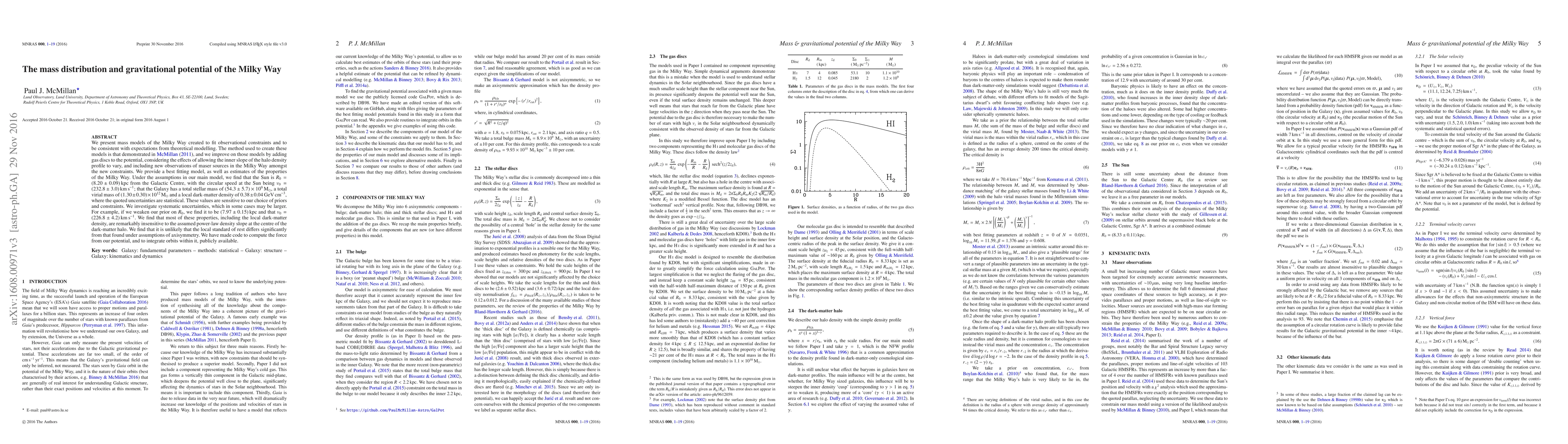 We present mass models of the Milky Way created to fit observational constraints and to be consistent with expectations from theoretical modelling. The method used to create these models is that demonstrated in McMillan (2011), and we improve on those models by adding gas discs to the potential, considering the effects of allowing the inner slope of the halo density profile to vary, and including new observations of maser sources in the Milky Way amongst the new constraints. We provide a best fitting model, as well as estimates of the properties of the Milky Way. Under the assumptions in our main model, we find that the Sun is $R_0 = (8.20\pm0.09)\,\mathrm{kpc}$ from the Galactic Centre, with the circular speed at the Sun being $v_0 = (232.8\pm3.0)\,\mathrm{km}\,\mathrm{s}^{-1}$; that the Galaxy has a total stellar mass of $(54.3\pm5.7)\times10^9\,{\rm M}_\odot$, a total virial mass of $(1.30 \pm 0.30)\times10^{12}\,{\rm M}_\odot$ and a local dark-matter density of $0.38\pm0.04\,\mathrm{GeV\,cm}^{-3}$, where the quoted uncertainties are statistical. These values are sensitive to our choice of priors and constraints. We investigate systematic uncertainties, which in some cases may be larger. For example, if we weaken our prior on $R_0$, we find it to be $(7.97\pm0.15)\,\mathrm{kpc}$ and that $v_0=(226.8\pm4.2)\,\mathrm{km}\,\mathrm{s}^{-1}$. We find that most of these properties, including the local dark-matter density, are remarkably insensitive to the assumed power-law density slope at the centre of the dark-matter halo. We find that it is unlikely that the local standard of rest differs significantly from that found under assumptions of axisymmetry. We have made code to compute the force from our potential, and to integrate orbits within it, publicly available.