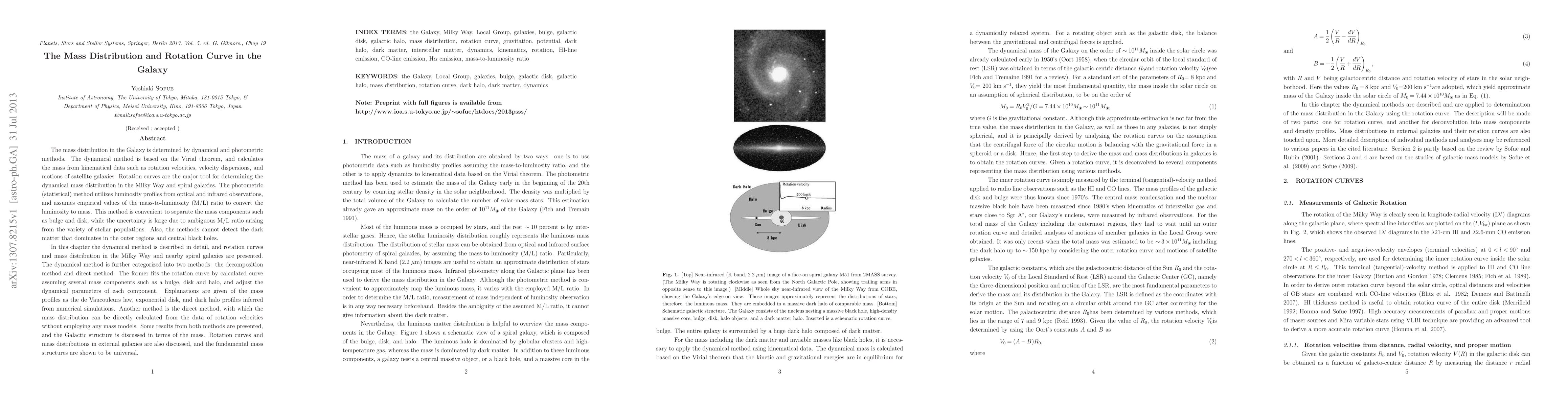The mass distribution in the Galaxy is determined by dynamical and photometric methods. Rotation curves are the major tool for determining the dynamical mass distribution in the Milky Way and spiral galaxies. The photometric (statistical) method utilizes luminosity profiles from optical and infrared observations, and assumes empirical values of the mass-to-luminosity (M/L) ratio to convert the luminosity to mass. In this chapter the dynamical method is described in detail, and rotation curves and mass distribution in the Milky Way and nearby spiral galaxies are presented. The dynamical method is categorized into two methods: the decomposition method and direct method. The former fits the rotation curve by calculated curve assuming several mass components such as a bulge, disk and halo, and adjust the dynamical parameters of each component. Explanations are given of the mass profiles as the de Vaucouleurs law, exponential disk, and dark halo profiles inferred from numerical simulations. Another method is the direct method, with which the mass distribution can be directly calculated from the data of rotation velocities without employing any mass models. Some results from both methods are presented, and the Galactic structure is discussed in terms of the mass. Rotation curves and mass distributions in external galaxies are also discussed, and the fundamental mass structures are shown to be universal.