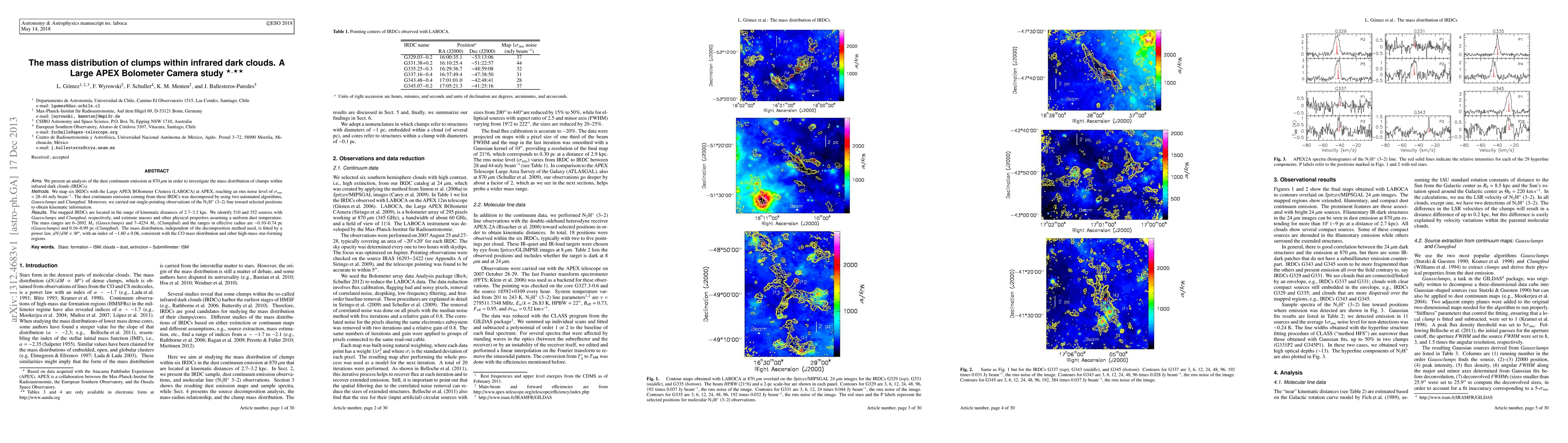 We present an analysis of the dust continuum emission at 870 um in order to investigate the mass distribution of clumps within infrared dark clouds (IRDCs). We map six IRDCs with the Large APEX BOlometer CAmera (LABOCA) at APEX, reaching an rms noise level of 28-44 mJy/beam. The dust continuum emission coming from these IRDCs was decomposed by using two automated algorithms, Gaussclumps and Clumpfind. Moreover, we carried out single-pointing observations of the N_2H^+ (3-2) line toward selected positions to obtain kinematic information. The mapped IRDCs are located in the range of kinematic distances of 2.7-3.2 kpc. We identify 510 and 352 sources with Gaussclumps and Clumpfind, respectively, and estimate masses and other physical properties assuming a uniform dust temperature. The mass ranges are 6-2692 Msun (Gaussclumps) and 7-4254 Msun (Clumpfind) and the ranges in effective radius are around 0.10-0.74 pc (Gaussclumps) and 0.16-0.99 pc (Clumpfind). The mass distribution, independent of the decomposition method used, is fitted by a power law, dN/dM propto M^alpha, with an index of -1.60 +/- 0.06, consistent with the CO mass distribution and other high-mass star-forming regions.