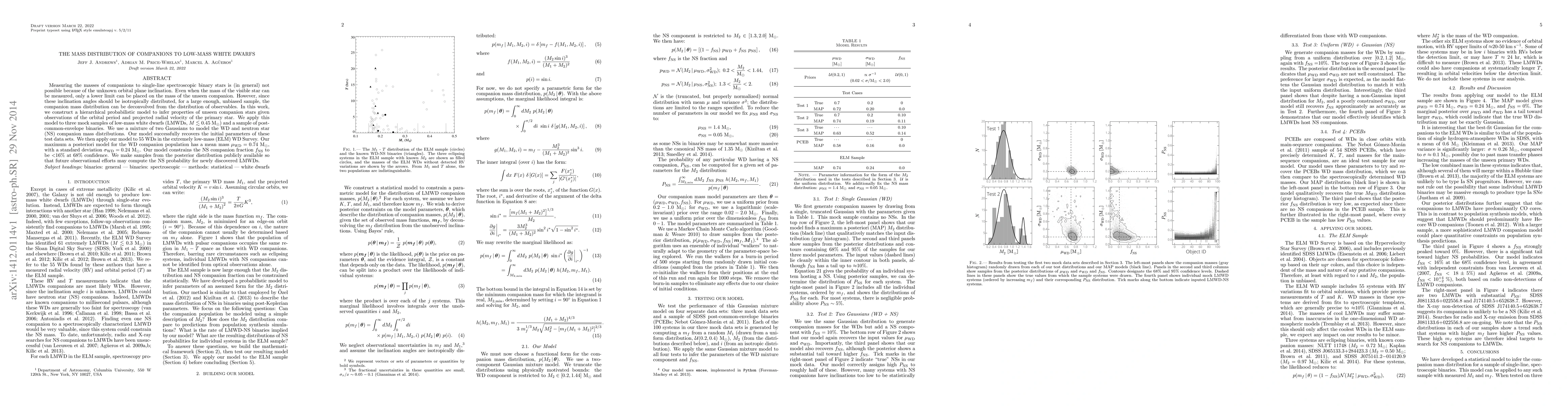 This paper develops a probabilistic model to infer the mass distribution of unseen companions to low-mass white dwarfs (LMWDs) using orbital period and radial velocity data. The model estimates a mean companion mass of 0.74 M☉ with a standard deviation of 0.24 M☉, and constrains the neutron star companion fraction to be less than 16% for LMWDs.