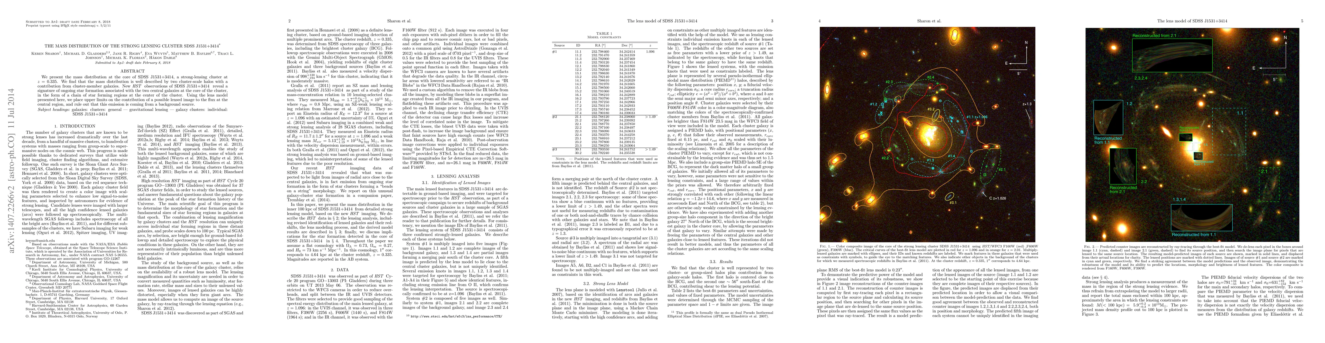 This paper investigates the mass distribution in the strong-lensing cluster SDSS J1531+3414, finding it best described by two cluster-scale halos and cluster-member galaxies. New HST observations reveal a chain of star-forming regions in the central galaxies, while the lens model rules out background source contributions to the central flux.