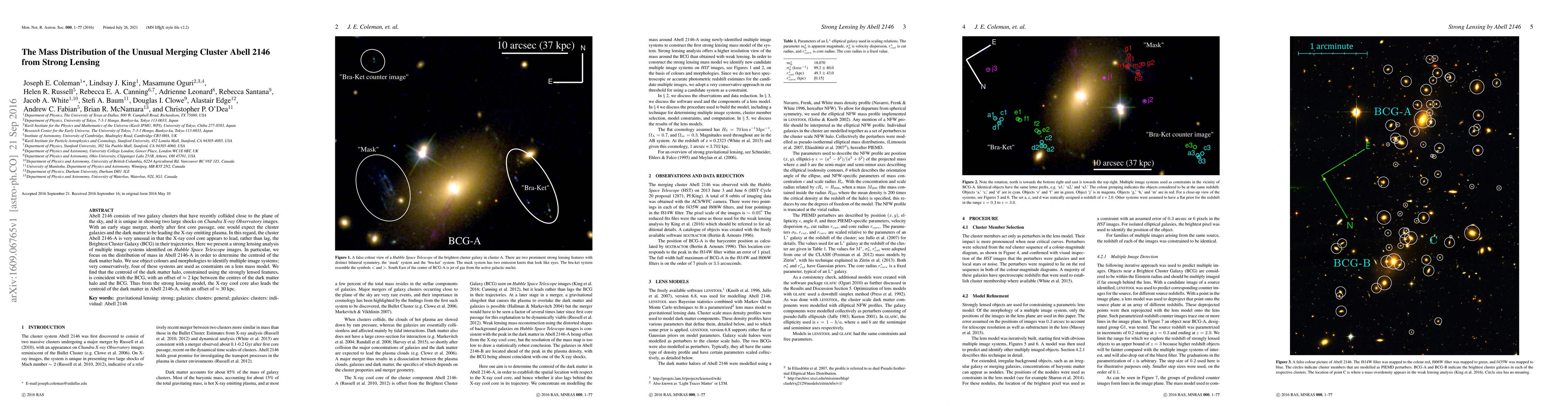 This study uses strong lensing analysis from Hubble Space Telescope images to investigate the mass distribution in the merging galaxy cluster Abell 2146, finding that the X-ray cool core leads the centroid of the dark matter halo by approximately 30 kpc, contrary to typical merger dynamics.