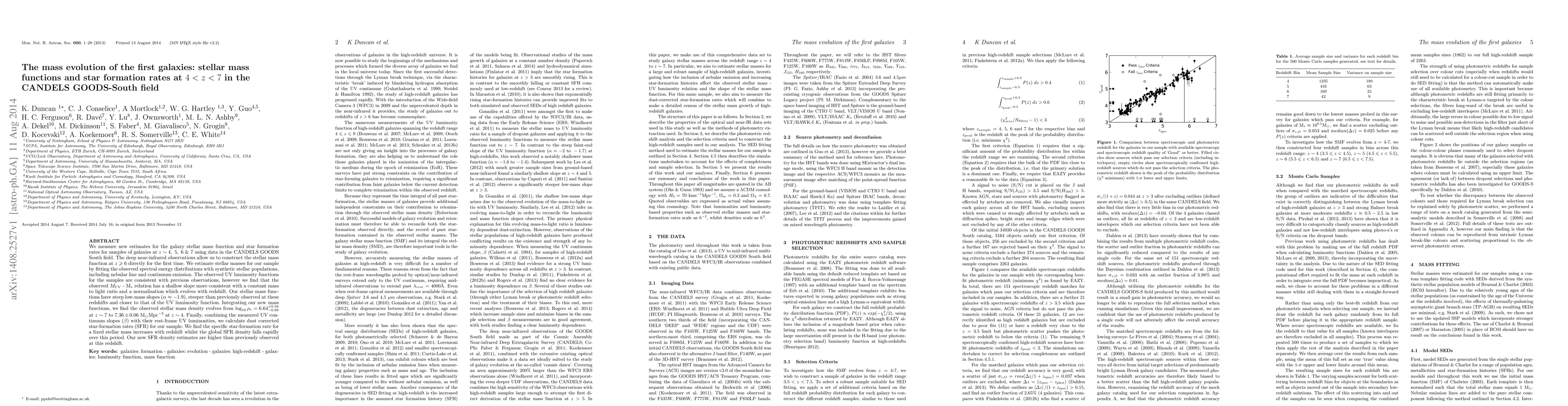 This paper measures the galaxy stellar mass function and star formation rates for galaxies at redshifts $z \sim 4$ to $7$ using CANDELS GOODS-South data, revealing a steep low-mass slope in the stellar mass function and a rapid decline in global star-formation rate density over this period.