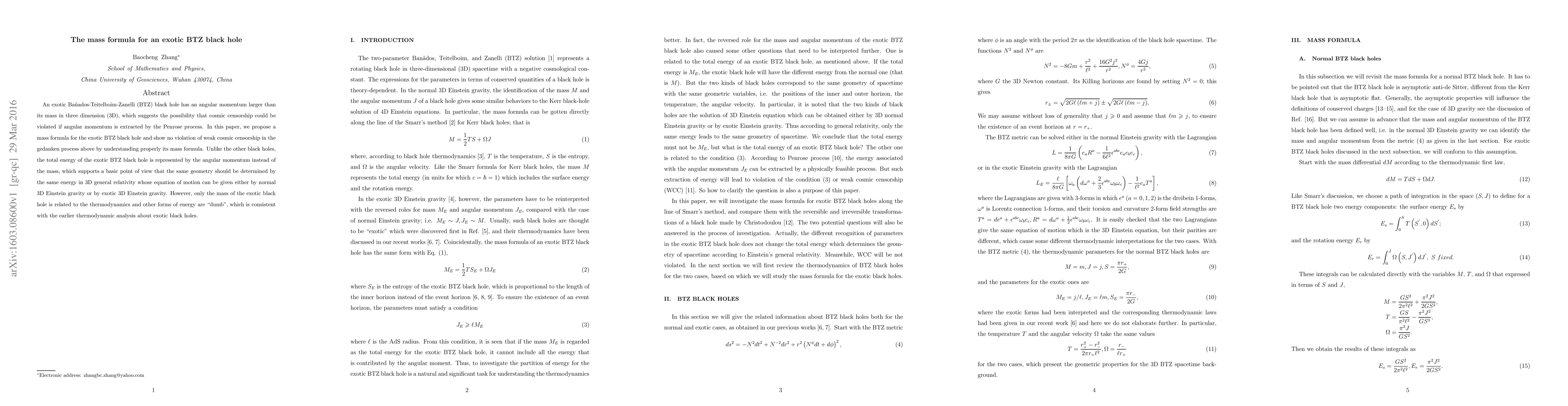 This paper proposes a mass formula for exotic Banados-Teitelboim-Zanelli (BTZ) black holes, demonstrating that their angular momentum can exceed their mass without violating weak cosmic censorship. It emphasizes that while the total energy is represented by angular momentum, only the mass relates to thermodynamics.