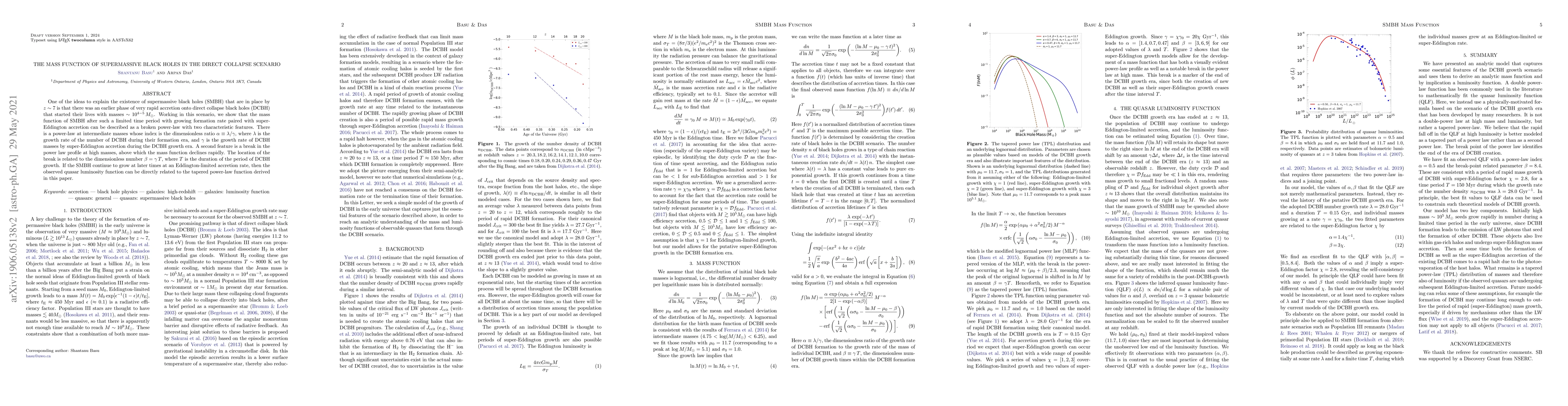 One of the ideas to explain the existence of supermassive black holes (SMBH) that are in place by z~7 is that there was an earlier phase of very rapid accretion onto direct collapse black holes (DCBH) that started their lives with masses ~ 10^4-10^5 M_solar. Working in this scenario, we show that the mass function of SMBH after such a limited time period with growing formation rate paired with super-Eddington accretion can be described as a broken power-law with two characteristic features. There is a power-law at intermediate masses whose index is the dimensionless ratio {\alpha} = {\lambda}/{\gamma}, where {\lambda} is the growth rate of the number of DCBH during their formation era, and {\gamma} is the growth rate of DCBH masses by super-Eddington accretion during the DCBH growth era. A second feature is a break in the power law profile at high masses, above which the mass function declines rapidly. The location of the break is related to the dimensionless number \b{eta} = {\gamma} T, where T is the duration of the period of DCBH growth. If the SMBH continue to grow at later times at an Eddington-limited accretion rate, then the observed quasar luminosity function can be directly related to the tapered power-law function derived in this paper.