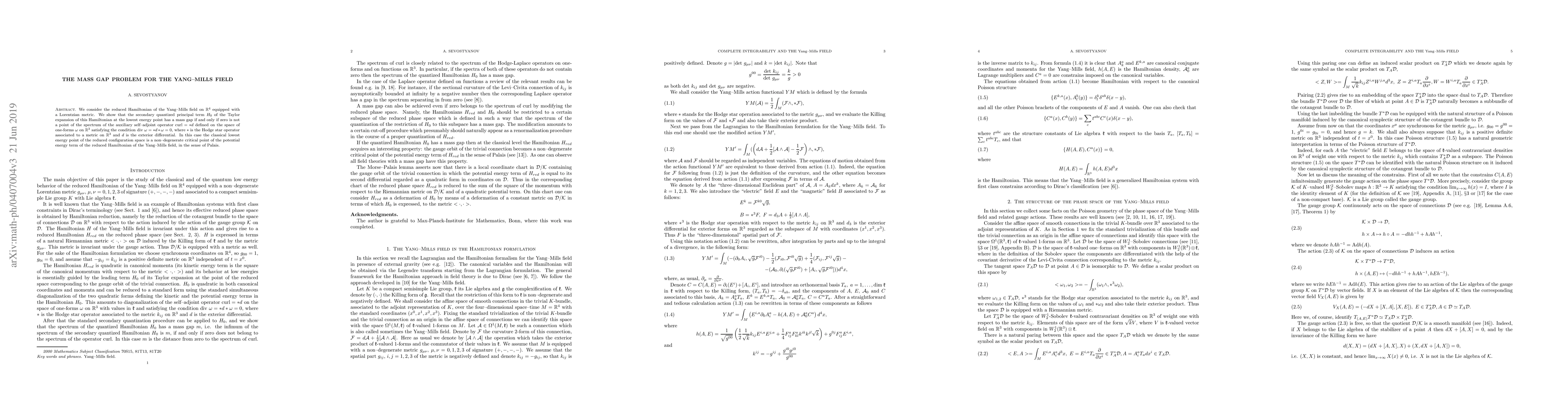 We consider the reduced Hamiltonian of the Yang-Mills field on $\mathbb{R}^4$ equipped with a Lorentzian metric. We show that the secondary quantized principal term $H_0$ of the Taylor expansion of this Hamiltonian at the lowest energy point has a mass gap if and only if zero is not a point of the spectrum of the auxiliary self-adjoint operator ${\rm curl}=*d$ defined on the space of one-forms $\omega$ on $\mathbb{R}^3$ satisfying the condition ${\rm div}~ \omega=*d*\omega=0$, where $*$ is the Hodge star operator associated to a metric on $\mathbb{R}^3$ and $d$ is the exterior differential. In this case the classical lowest energy point of the reduced configuration space is a non-degenerate critical point of the potential energy term of the reduced Hamiltonian of the Yang-Mills field, in the sense of Palais.