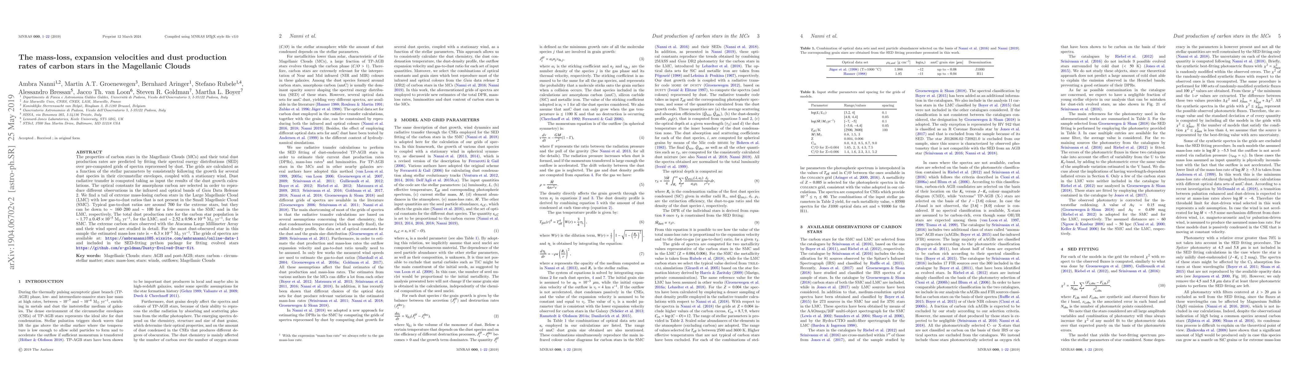 This paper investigates the mass-loss, expansion velocities, and dust production rates of carbon stars in the Magellanic Clouds using spectral energy distribution fitting. The study finds extreme mass-losing carbon stars in the LMC with low gas-to-dust ratios, and estimates total dust production rates for the carbon star populations in both the LMC and SMC.