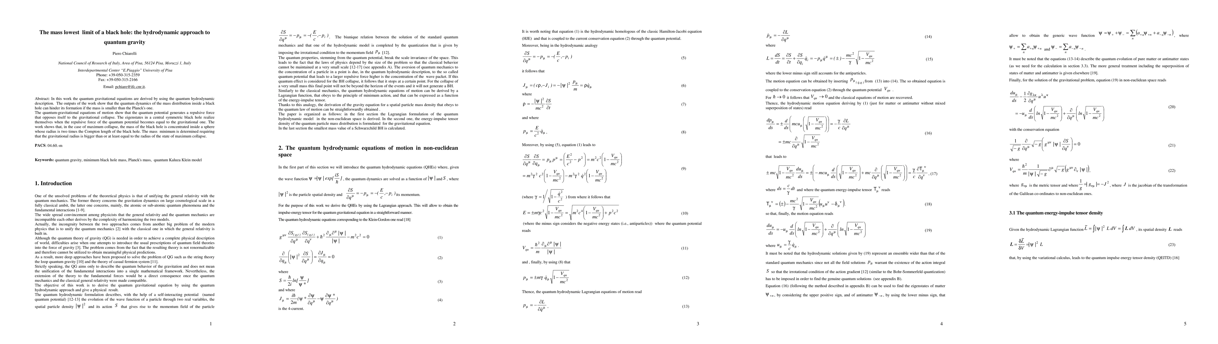 In this work the quantum gravitational equations are derived by using the quantum hydrodynamic description. The outputs of the work show that the quantum dynamics of the mass distribution inside a black hole can hinder its formation if the mass is smaller than the Planck's one. The quantum-gravitational equations of motion show that the quantum potential generates a repulsive force that opposes itself to the gravitational collapse. The eigenstates in a central symmetric black hole realize themselves when the repulsive force of the quantum potential becomes equal to the gravitational one. The work shows that, in the case of maximum collapse, the mass of the black hole is concentrated inside a sphere whose radius is two times the Compton length of the black hole. The mass minimum is determined requiring that the gravitational radius is bigger than or at least equal to the radius of the state of maximum collapse.