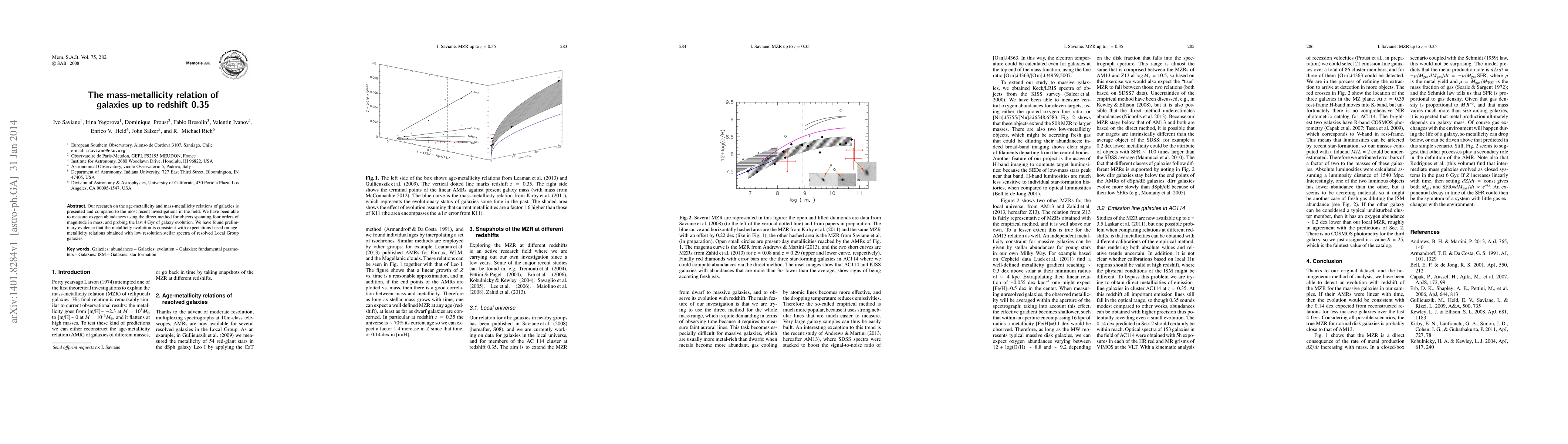 This study examines the mass-metallicity relation in galaxies up to redshift 0.35, finding that metallicity evolution aligns with age-metallicity relations derived from Local Group galaxies' spectra. Oxygen abundances were measured directly across a wide mass range, providing insights into the last 4 Gyr of galaxy evolution.