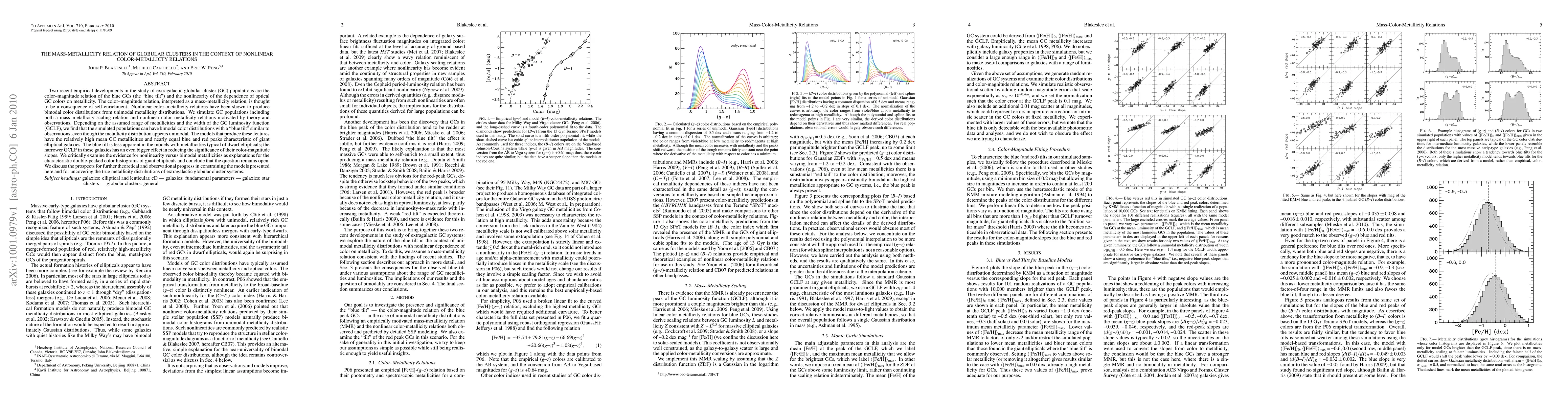 This paper investigates the mass-metallicity relation in globular clusters (GCs) and explores how nonlinear color-metallicity relations can produce bimodal color distributions despite unimodal metallicity distributions. The study finds that models with high mean metallicities and broad luminosity functions can replicate observed "blue tilt" features, while those with lower metallicities and narrower luminosity functions show less pronounced effects. The paper concludes that the cause of the double-peaked color histograms in giant ellipticals remains uncertain.