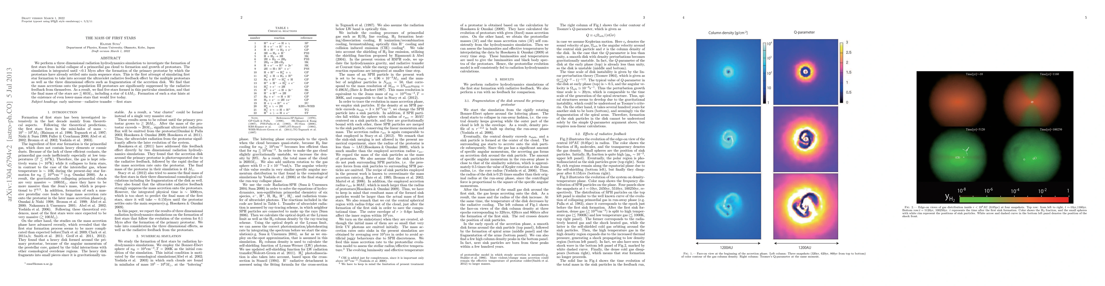 We perform a three dimensional radiation hydrodynamics simulation to investigate the formation of first stars from initial collapse of a primordial gas cloud to formation and growth of protostars. The simulation is integrated until 0.1 Myrs after the formation of the primary protostar by which the protostars have already settled onto main sequence stars. This is the first attempt of simulating first star formation to take into account the ultraviolet radiative feedback effect by the multiple protostars as well as the three dimensional effects such as fragmentation of the accretion disk. We find that the mass accretions onto the population III protostars are significantly suppressed by the radiative feedback from themselves. As a result, we find five stars formed in this particular simulation, and that the final mass of the stars are < 60Msun, including a star of 4.4Msun. Formation of such a star hints at the existence of even lower-mass stars that would live today.