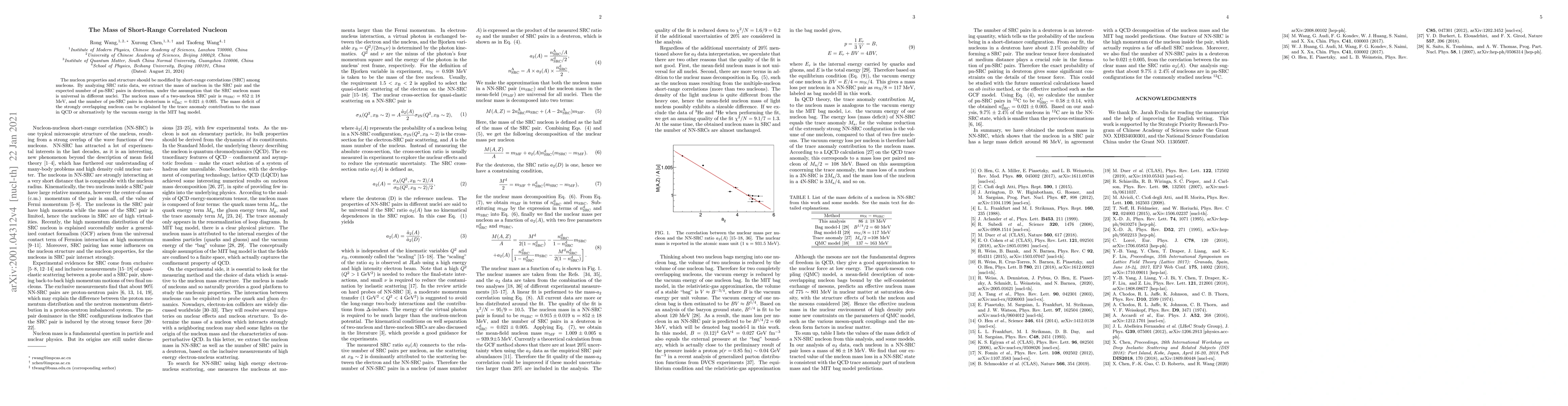 The nucleon properties and structure should be modified by short-range correlations (SRC) among nucleons. By analyzing SRC ratio data, we extract the mass of nucleon in the SRC pair and the expected number of pn-SRC pairs in deuterium, under the assumption that the SRC nucleon mass is universal in different nuclei. The nucleon mass of a two-nucleon SRC pair is $m_{\text{SRC}}=852\pm 18$ MeV, and the number of pn-SRC pairs in deuterium is $n^{\text{d}}_{\text{SRC}}=0.021\pm 0.005$. The mass deficit of the strongly overlapping nucleon can be explained by the trace anomaly contribution to the mass in QCD or alternatively by the vacuum energy in the MIT bag model.