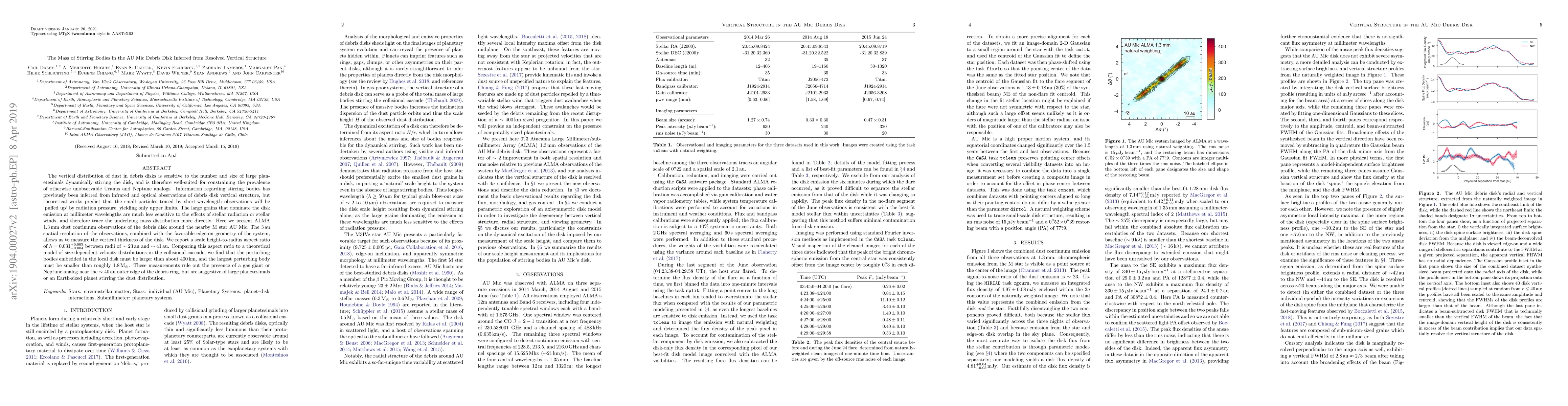 The vertical distribution of dust in debris disks is sensitive to the number and size of large planetesimals dynamically stirring the disk, and is therefore well-suited for constraining the prevalence of otherwise unobservable Uranus and Neptune analogs. Information regarding stirring bodies has previously been inferred from infrared and optical observations of debris disk vertical structure, but theoretical works predict that the small particles traced by short-wavelength observations will be `puffed up' by radiation pressure, yielding only upper limits. The large grains that dominate the disk emission at millimeter wavelengths are much less sensitive to the effects of stellar radiation or stellar winds, and therefore trace the underlying mass distribution more directly. Here we present ALMA 1.3 mm dust continuum observations of the debris disk around the nearby M star AU Mic. The 3 au spatial resolution of the observations, combined with the favorable edge-on geometry of the system, allows us to measure the vertical thickness of the disk. We report a scale height-to-radius aspect ratio of $h = 0.031_{-0.004}^{+0.005}$ between radii of $\sim 23$ au and $\sim 41$ au. Comparing this aspect ratio to a theoretical model of size-dependent velocity distributions in the collisional cascade, we find that the perturbing bodies embedded in the local disk must be larger than about 400 km, and the largest perturbing body must be smaller than roughly 1.8 M$_\odot$. These measurements rule out the presence of a gas giant or Neptune analog near the $\sim 40$ au outer edge of the debris ring, but are suggestive of large planetesimals or an Earth-sized planet stirring the dust distribution.
