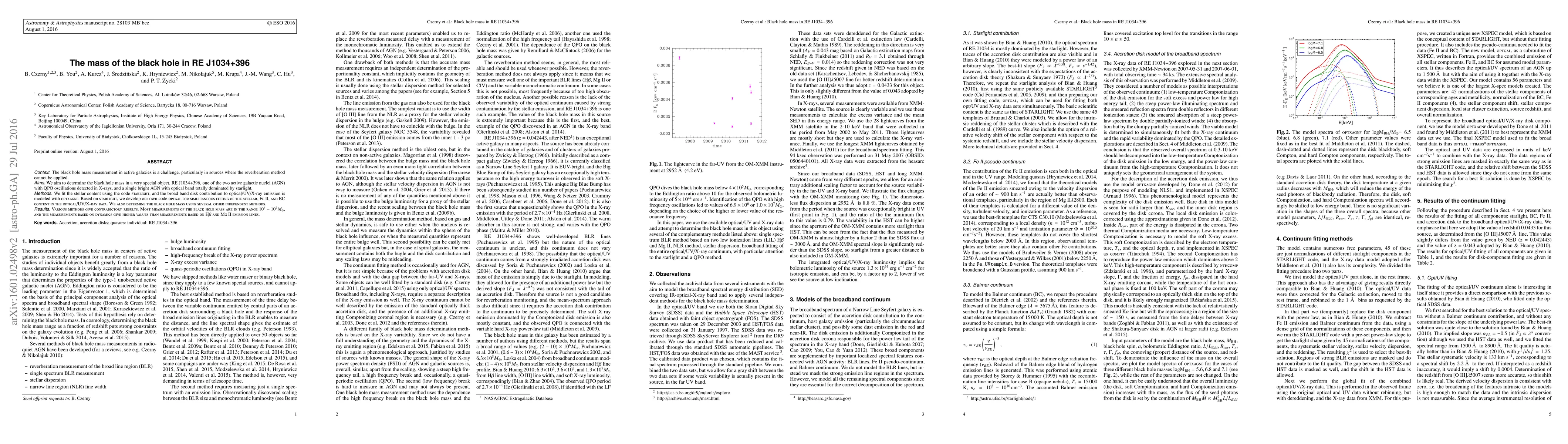 The black hole mass measurement in active galaxies is a challenge, particularly in sources where the reverberation method cannot be applied. We aim to determine the black hole mass in a very special object, RE J1034+396, one of the two AGN with QPO oscillations detected in X-rays, and a single bright AGN with optical band totally dominated by starlight. We fit the stellar content using the code starlight, and the broad band disk contribution to optical/UV/X-ray emission is modeled with optxagnf. We also determine the black hole mass using several other independent methods. Various methods give contradictory results. Most measurements of the blacc hole mass are in the range 1.e6-1.e7 Msun, and the measurements based on dynamics give higher values than measurements based on Hbeta and Mg II emission lines.